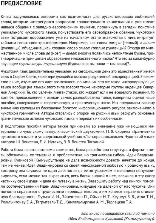 Эта книга - скромная лепта в дело сохранения чукотского языка. В пособии рассматриваются буквы и звуки чукотского языка, части речи и связанные с ними основные грамматические правила. Для практического усвоения материала каждый грамматический модуль сопровождается заданиями с ключами. Дополнительно предлагаются упражнения, связанные с самыми сложными вопросами чукотского языка — разнообразными комплексами.