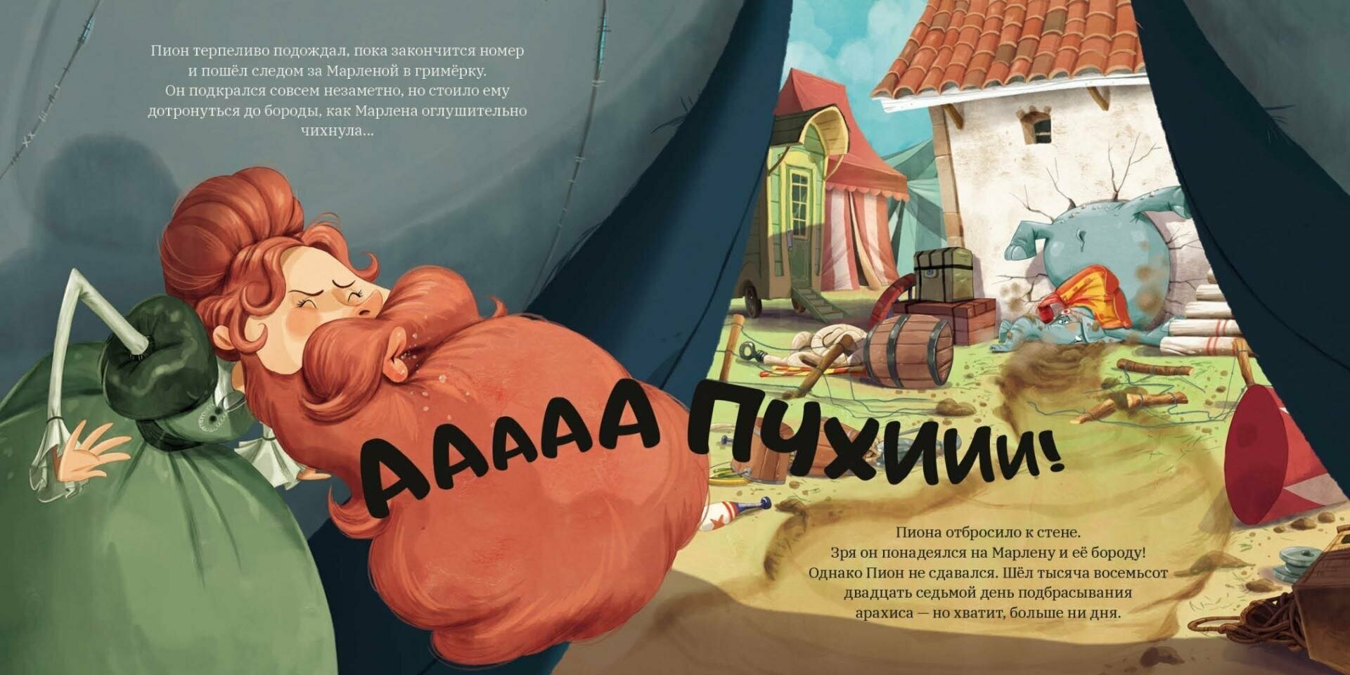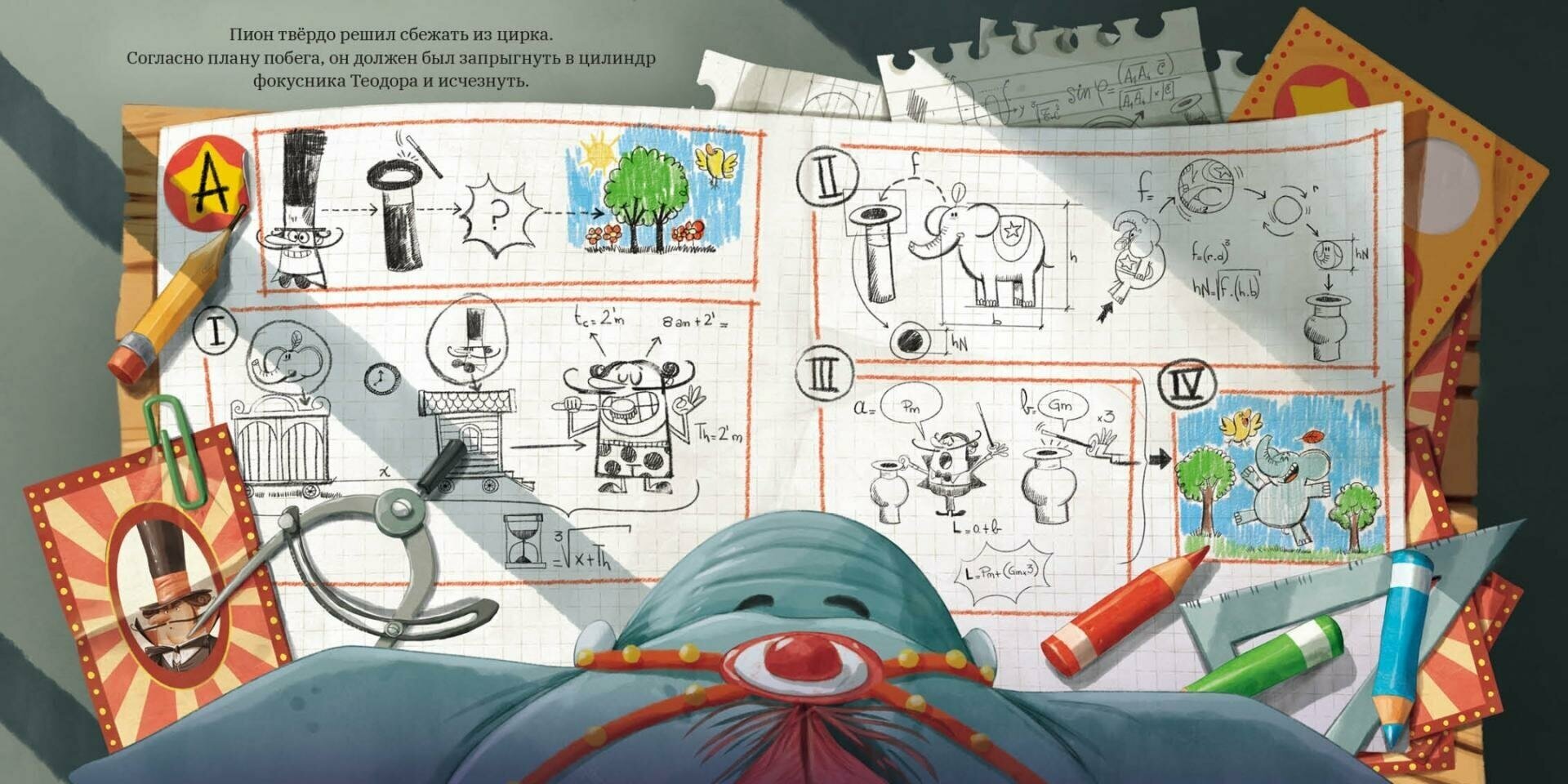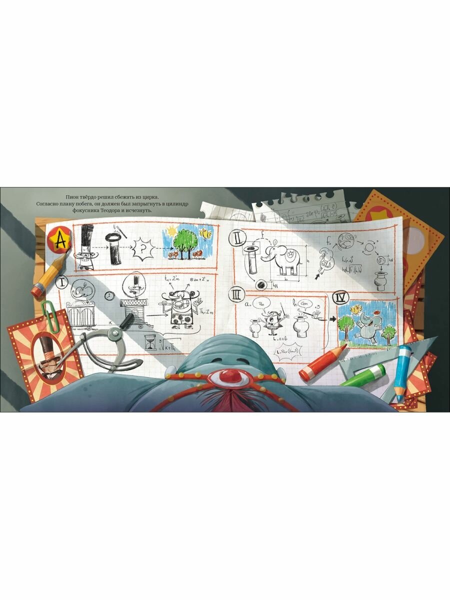При весьма простом (примитивном) сюжете про циркового слона по имени Пион, который решил больше не выступать на арене с номером про арахис, эта книга вызывает улыбки на лице детей, которые разглядывают рисунки и чертежи Пиона, составляемые им под покровом ночи. У Пиона есть мечта покинуть цирк-шапито, в котором живут бородатая женщина Марлена, фокусник Теодор, звери из шляпы Теодора: кролики, голуби и лама и гимнастка Корнелия. Каждый план Побега раскрывает маленькие секреты цирковых обитателей. Фокусник Теодор живёт строго по расписанию и чистит зубы ровно 2 минуты, бородатая женщина Марлена любит посещать барбершоп и пить кофе, пока приводят в порядок её бороду. А ещё она с удивительной силой чихает. А в итоге самым простым для Пиона оказалась возможность стащить ключи у уснувшего в кресле сторожа и просто уйти из цирка. Рисунки мультяшные и нравятся детям. Нигма в очередной раз порадовала новинкой.