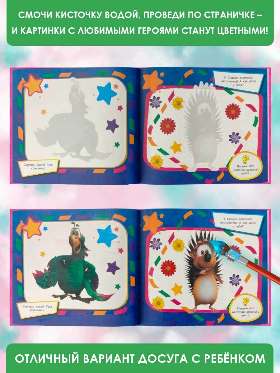 Нужно только смочить кисточку водой, провести по страничке - и картинки с любимыми героями станут цветными!