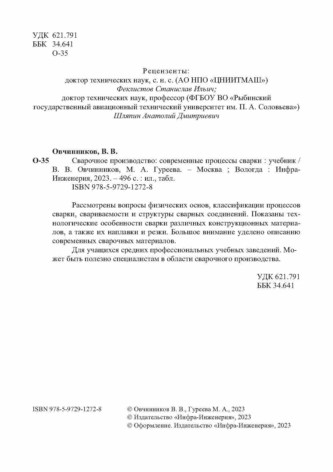 Сварочное производство. Современные процессы сварки. Том 1 (Овчинников Виктор Васильевич, Гуреева Марина Алексеевна); Инфра-Инженерия, 2023