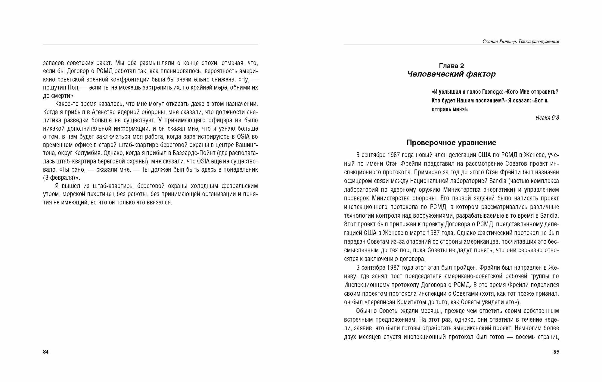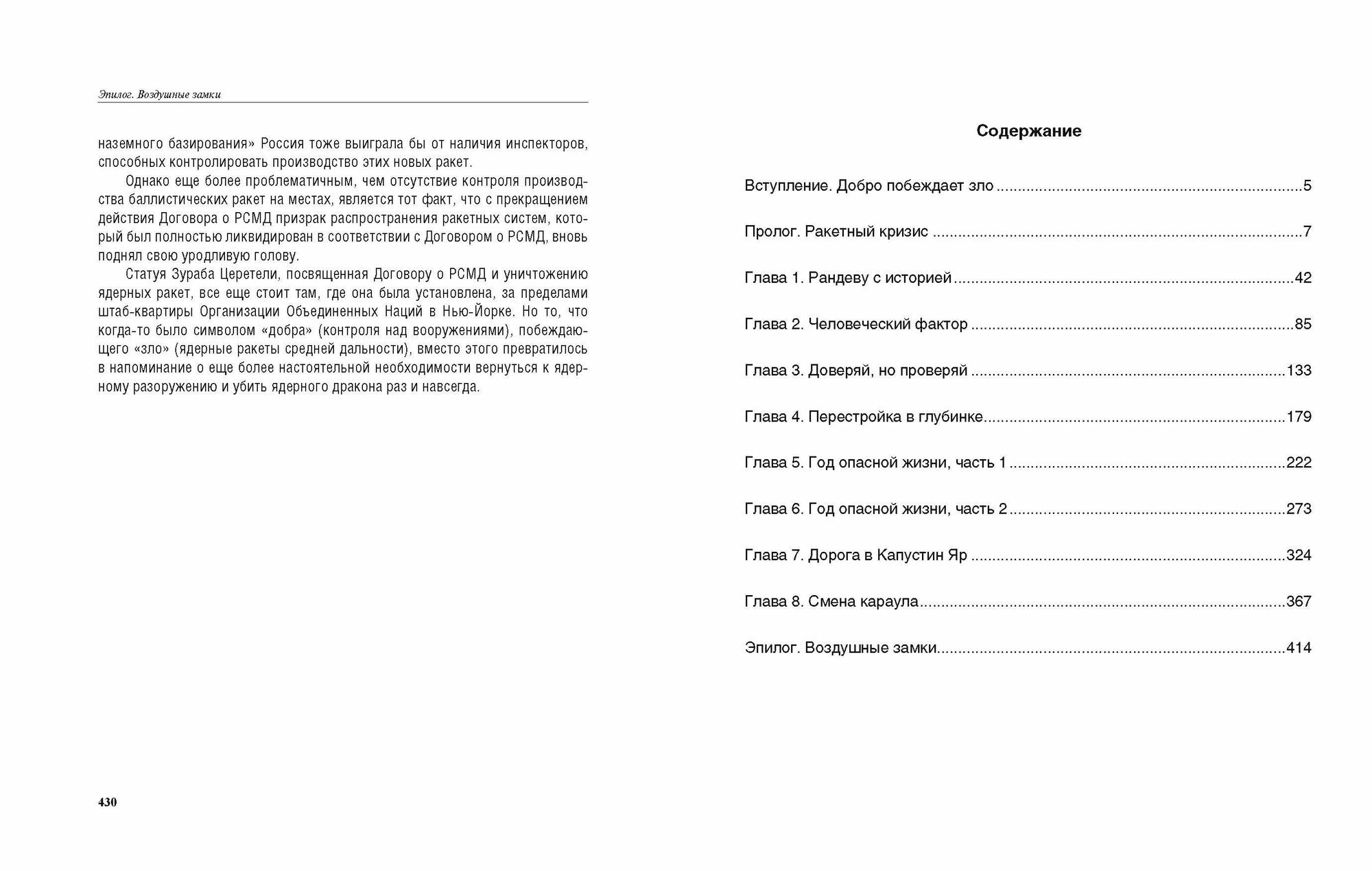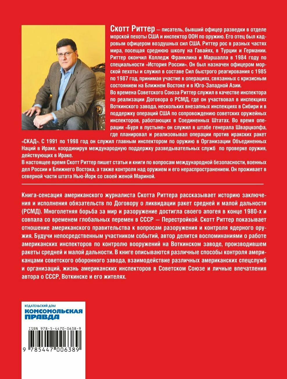 Книга-сенсация американского журналиста Скотта Риттера рассказывает историю заключения и исполнения обязательств по Договору о ликвидации ракет средней и малой дальности (РСМД). Многолетняя борьба за мир и разоружение достигла своего апогея в конце 1980-х и совпала со временем глобальных перемен в СССР — Перестройкой. Скотт Риттер показывает отношение американского правительства к вопросам разоружения и контроля ядерного оружия. Будучи непосредственным участником событий, автор делится воспоминаниями о работе американских инспекторов по контролю вооружений на Воткинском заводе, производившем ракеты средней и малой дальности. В книге описываются различные способы контроля американцами советского оборонного завода, взаимодействие различных американских спецслужб и организаций, жизнь американских инспекторов в Советском Союзе и личные впечатления автора о СССР, Воткинске и его жителях.