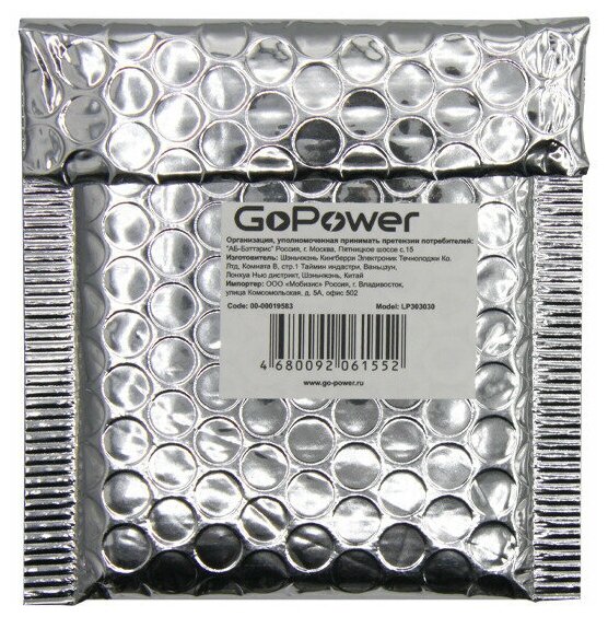 Литий-ионный полимер (Lithium Ion Polymer, или Li-Ion Pol), чаще называемые Li-Po - самый распространенный на сегодняшний день тип батарей, используемый во всем мобильном оборудовании. Это и мобильные телефоны, и вся цифровая техника, гарнитуры, плееры, ноутбуки, нетбуки, радиоуправляемые игрушки и многие другие устройства.Торговая марка GoPower предлагает линейку сменных литий-полимерных аккумуляторов.Снабжены универсальными контактными выводами.Встроенная электронная схема, которая предотвращает перезаряд и перегрев аккумулятора вследствие слишком интенсивного заряда.Удобная и прочная упаковка типа «bubble bag» сохраняет аккумулятор от механического повреждения.