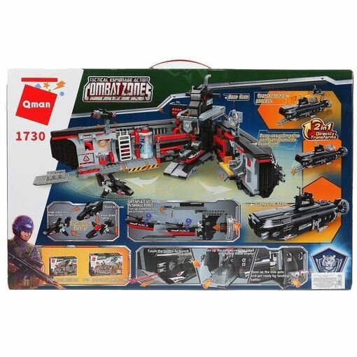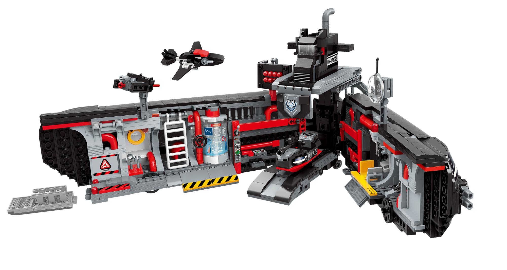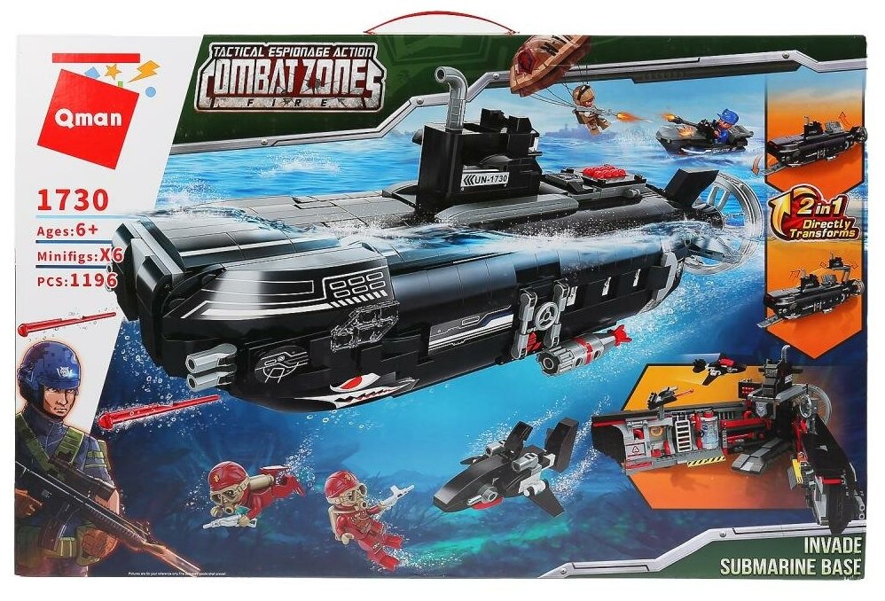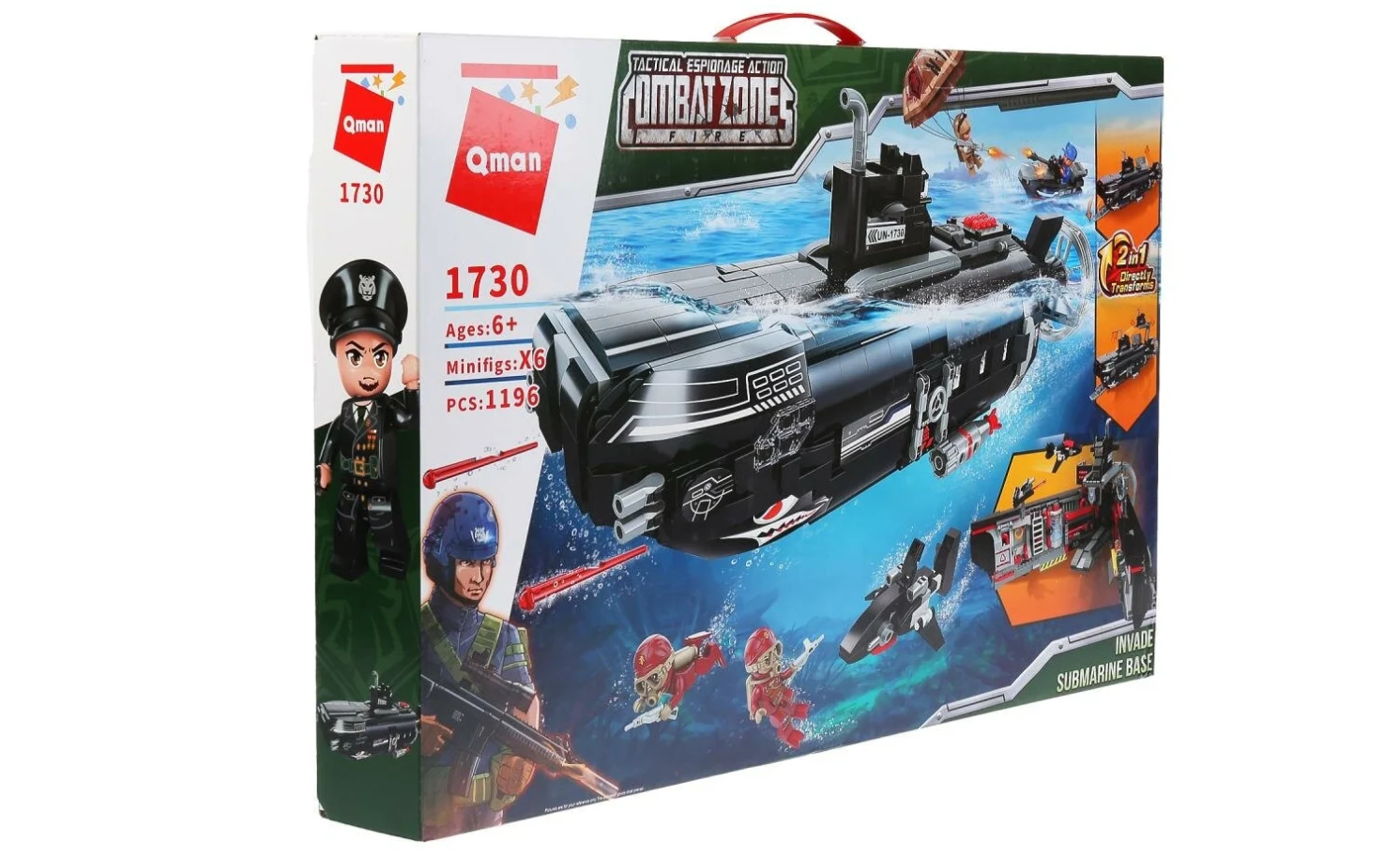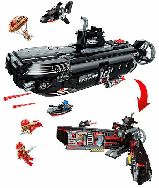 Из пластиковых деталей, входящих в данный набор, ребёнок сможет сконструировать мощную подводную лодку и пару дополнительных военных единиц техники. Подводная лодка открывается, её внутренне пространство также можно использовать для игры, а затем. Такой продуманный до мелочей набор надолго увлечёт маленького непоседу.