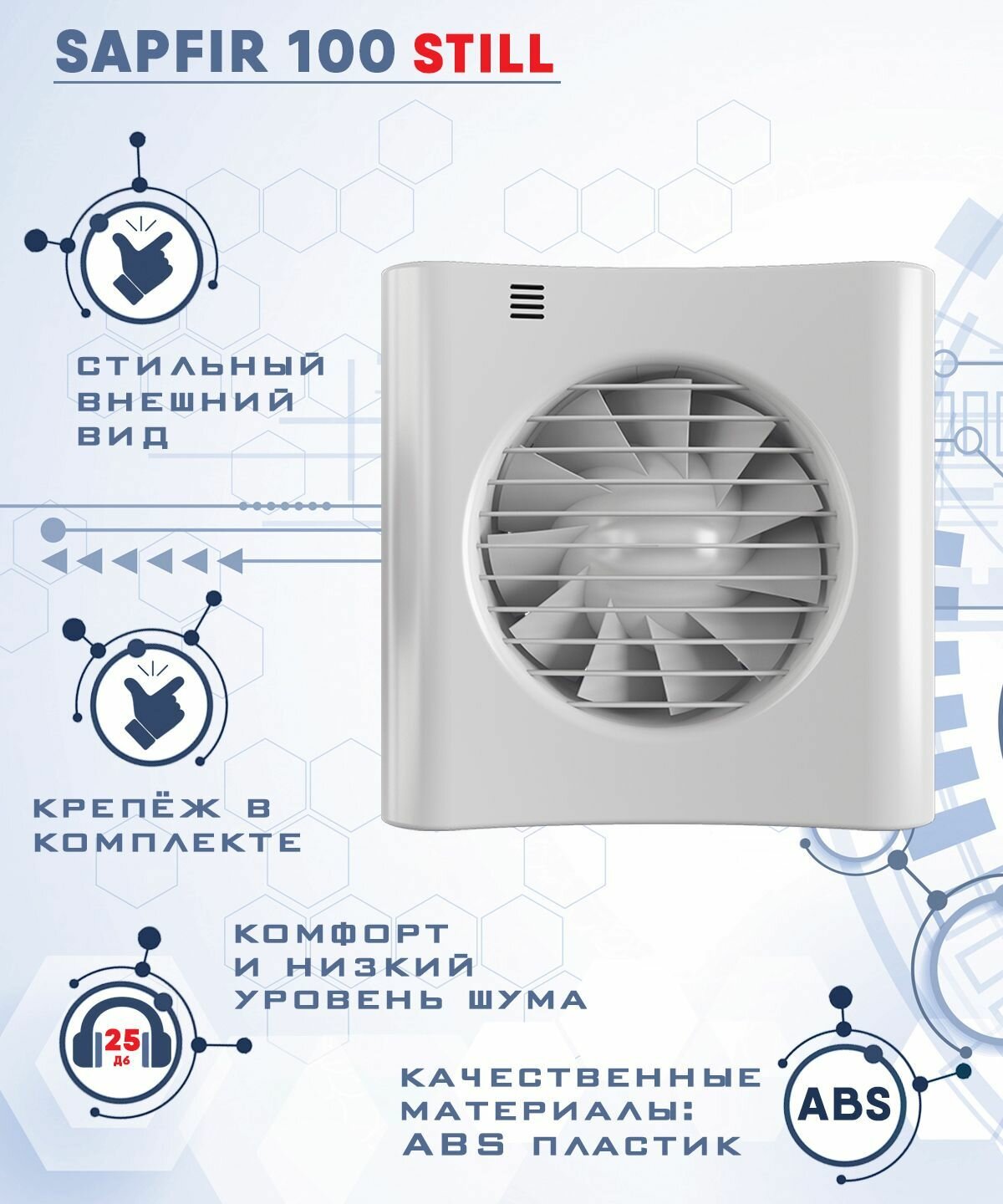 Корпус и крыльчатка выполнены из высококачественного и прочного ABS-пластика, стойкого к ультрафиолету. Двигатель оборудован защитой от перегрева.