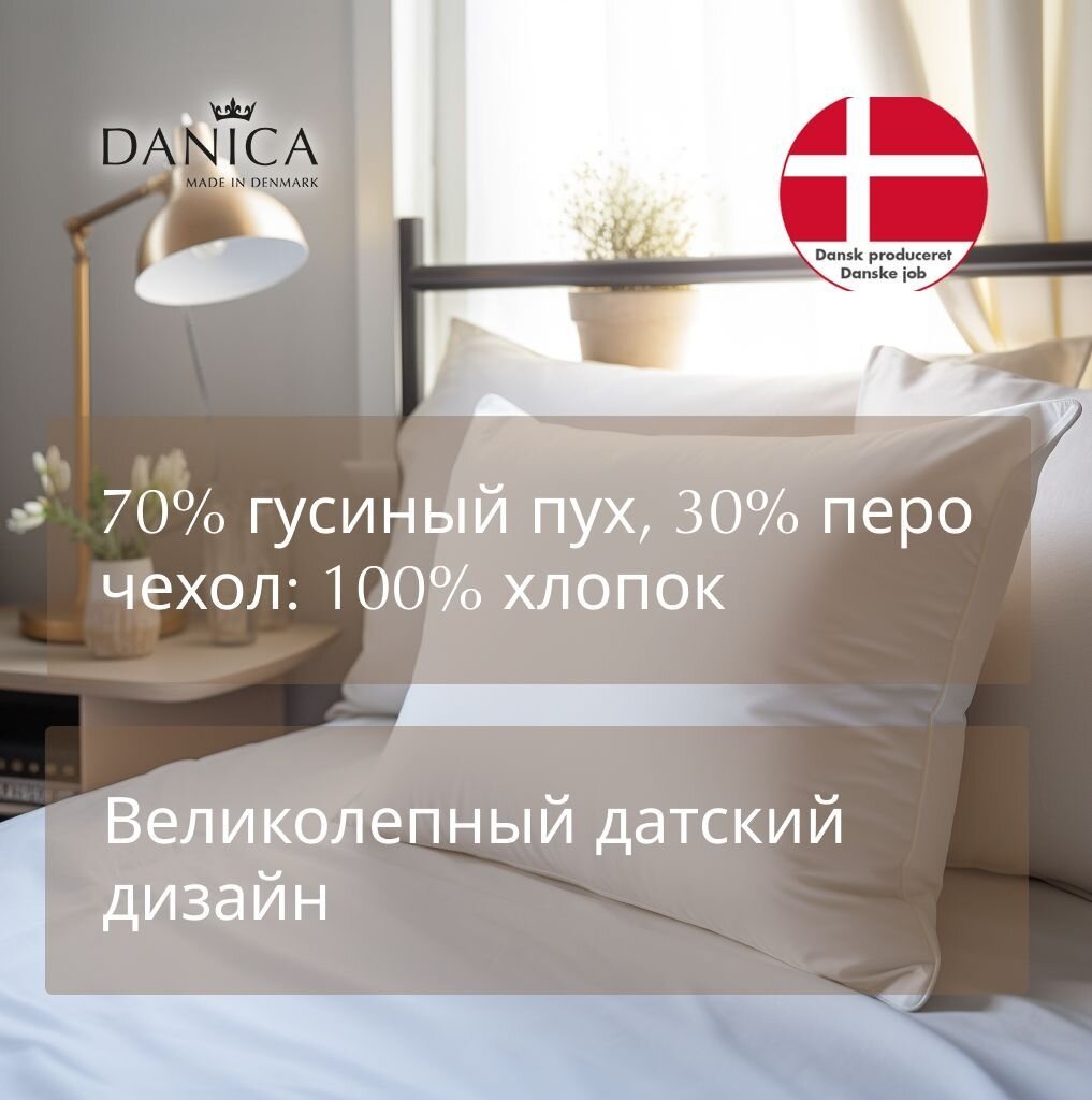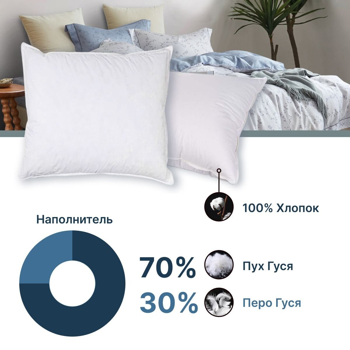| Состав | Наполнитель 70% гусиный пух, 30% перо; чехол 100% хлопок |