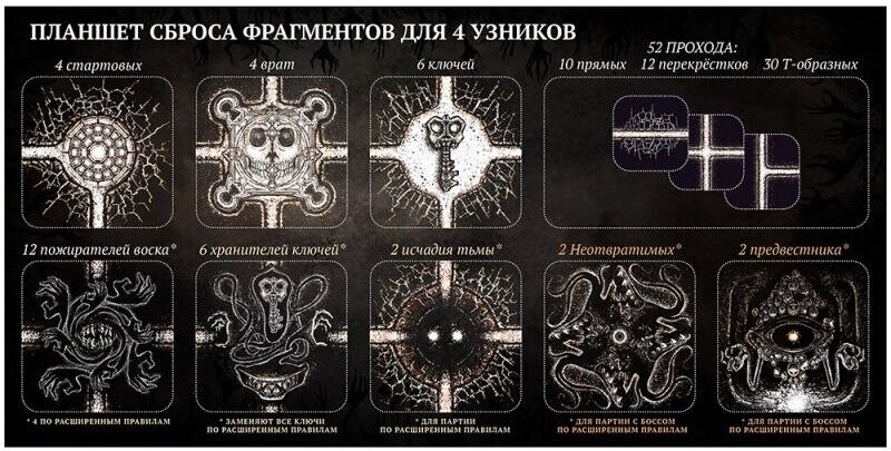 Падение в темнотуСначала вам нужно найти и подобрать ключ, а затем отыскать врата. Только собравшись вместе возле врат, вы сможете повернуть ключи и выбраться из лабиринта. Вы проиграете, если все четыре фрагмента с вратами поглощены тьмой, кто-то не смог взять ключ, или не смогли добраться до врат и все пути перекрыла тьма. Края игрового поля замыкаются на противоположную сторону, образуя бесконечный круг. Выйдя за границы верхней клетки, вы окажетесь на нижней. За ход вы можете исследовать лабиринт, передвинуться или остаться на месте. Вас будут ждать ямы и разрушающиеся фрагменты, а также монстры. Кстати, благодаря последним вы можете регулировать сложность игры.