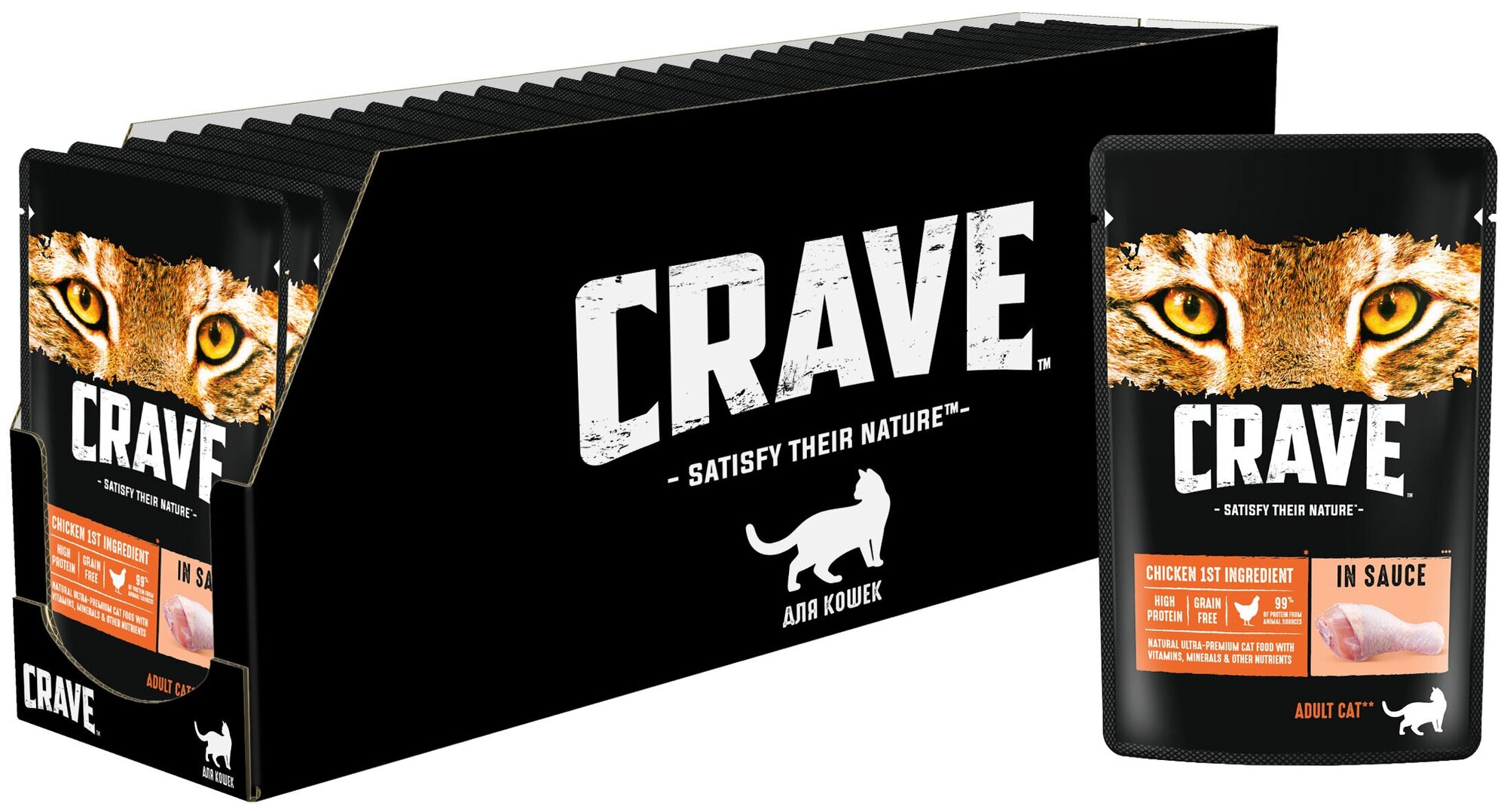 Влажный корм CRAVE для взрослых кошек, содержащий минимум 99% ингредиентов животного происхождения, вдохновлен естественным рационом кошки. Ингредиент № 1 в нем — настоящее мясо. Это придает питомцу энергию, насыщает белком и поддерживает организм в тонусе.