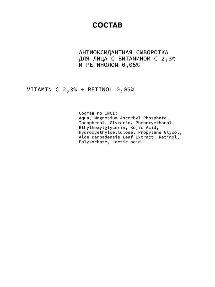 Витамин С в устойчивой форме аскорбилфосфата магния не раздражает чувствительную и воспаленную кожу, а также осветляет цвет лица. Благодаря сочетанию с ретинолом и койевой кислотой в мягкой дозировке улучшается и омолаживается структура кожи, предотвращается появление постакне-образований. Продукт рекомендован для чувствительного эпидермиса, а также в качестве подготовки кожи к высококонцентрированным ретиноловым уходам