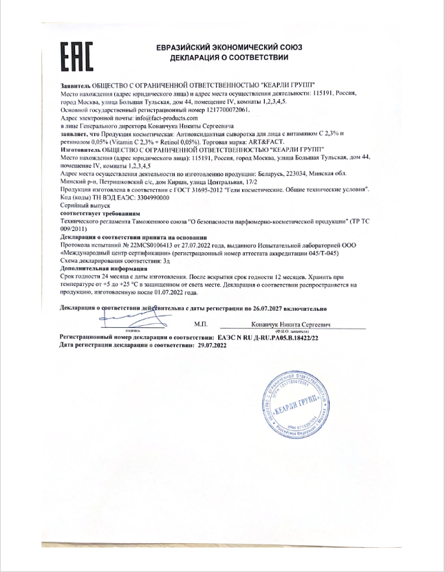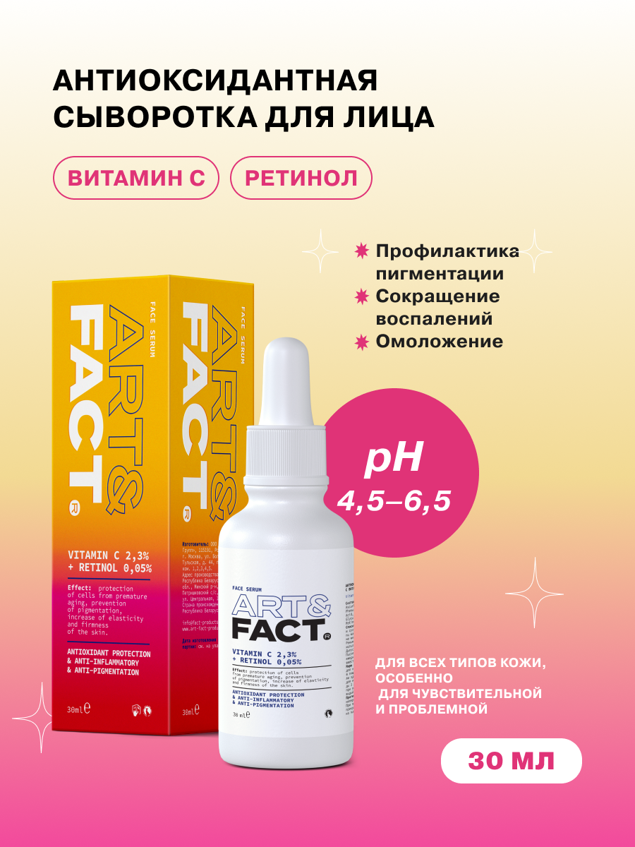 Антиоксидантная сыворотка с витамином С 23% + ретинолом 005% для лица 30 мл ART&FACT (ЭХ99989443511)