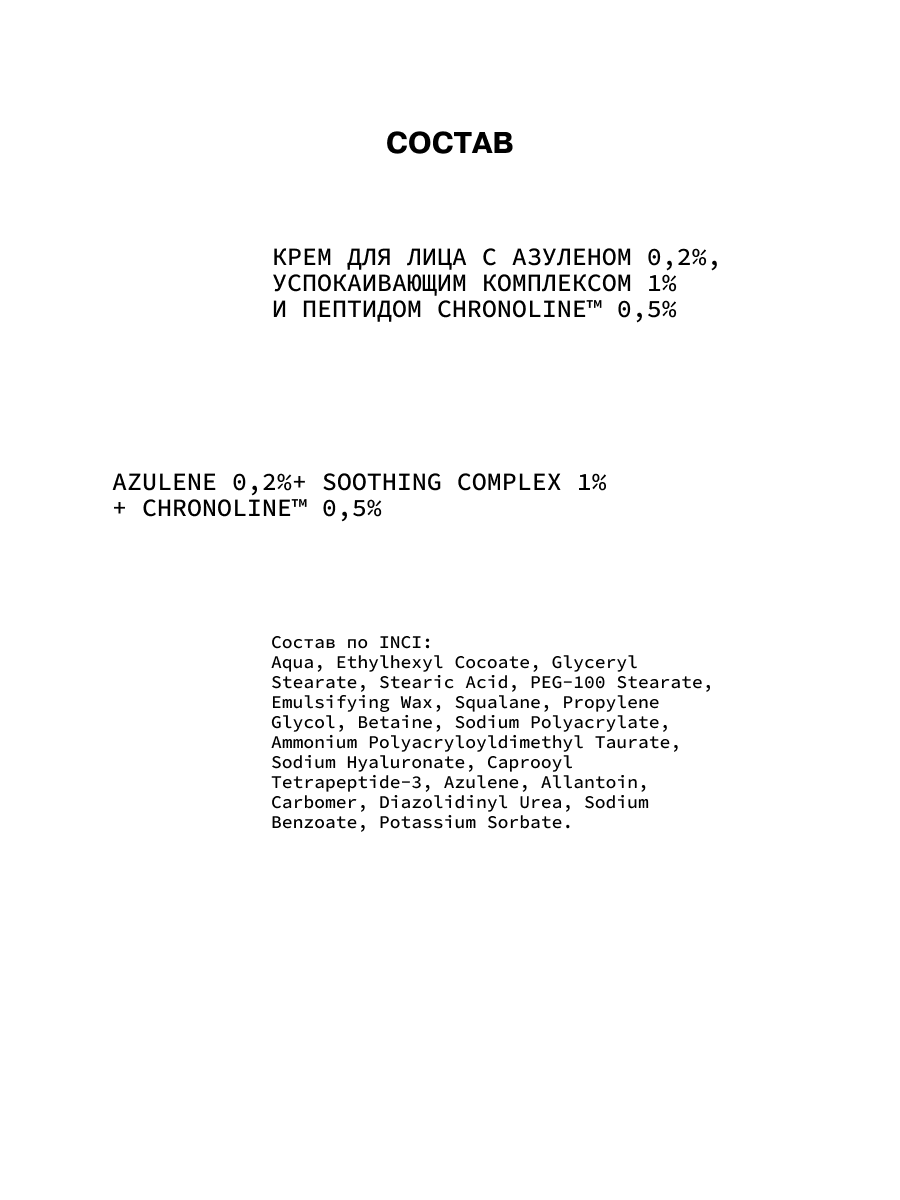 Состав: aqua, ethylhexyl cocoate, glyceryl stearate, stearic acid, peg-100 stearate, emulsifying wax, squalane, propylene glycol, betaine, sodium polyacrylate, ammonium polyacryloyldimethyl taurate, sodium hyaluronate, caprooyl tetrapeptide-3, azulene, allantoin, carbomer, diazolidinyl urea, sodium benzoate, potassium sorbate.