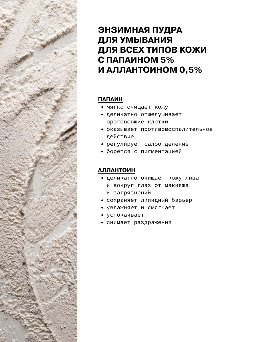 Папаин обеспечивает глубокое очищающее действие пудры, препятствует образованию сальных пробок и черных точек, а также деликатно отшелушивает кожу. Комплекс мягких ПАВ очищает кожу от пыли, пота, себума и других загрязнений из окружающей среды, не пересушивая ее, а аллантоин смягчает кожу и снимает раздражения.