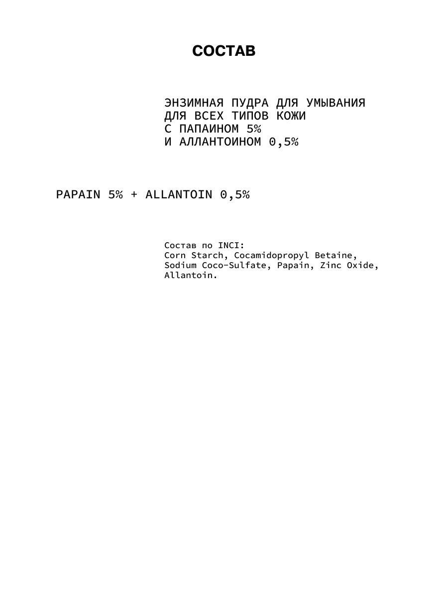 Состав: corn starch, cocamidopropyl betaine, sodium coco-sulfate, papain, zinc oxide, allantoin.
