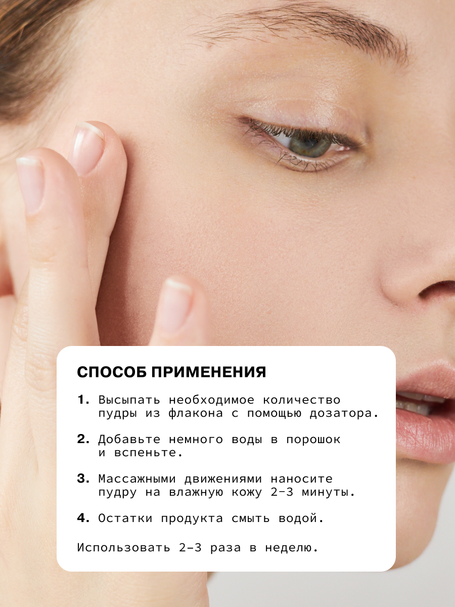 Высыпать необходимое количество пудры из флакона с помощью дозатора. При добавлении воды вспенить порошок, нанести на влажную кожу. Массировать кожу лица 2–3 минуты. Остатки продукта смыть водой. Использовать 2–3 раза в неделю.