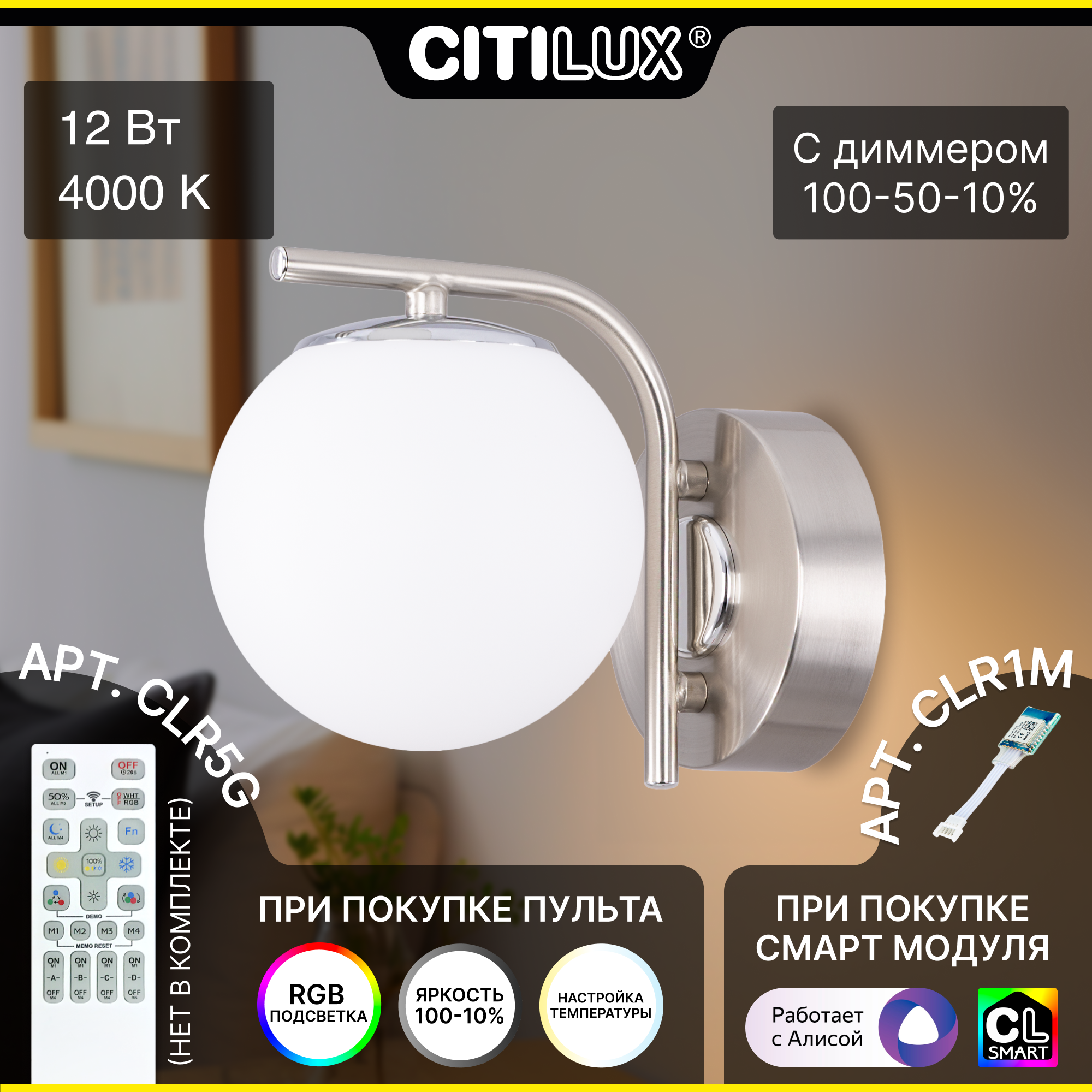 Светильник настенный светодиодный (без пульта) Citilux Адам Смарт выполнен в современном стиле. Бра однорожковое, корпус металлический, цвет матовый хром. Плафон в форме шара, изготовлен из оптического полимера, цвет белый матовый. В основании плафона расположен уникальный светодиодный модуль, обеспечивающий яркое основное освещение или красочную RGB подсветку (для управления подсветкой нужен пульт). Мощность 12Вт, световой поток 1300Лм. Предустановлено 4 режима освещения, с управлением обычным настенным выключателем.* Опционально: управляется радиопультом дистанционного управления артикул - CLR5G (не входит в комплект, приобретается отдельно или в комплекте с другими светильниками экосистемы Citilux);При наличии пульта доступны: плавная регулировка цветовой температурой в диапазоне 3000-5500К, позволяет настроить любые оттенки теплого, нейтрального или холодного света; два режима работы RGB подсветки; плавная регулировка яркости света; есть режимы памяти и отсроченного выключения.При установке дополнительного смарт-модуля артикул - CLR1M (не входит в комплект, приобретается отдельно) светильник становится умным. Используя сеть Wi-Fi, при наличии интернет-соединения, можно полноценно управлять всеми режимами работы светильника из приложения Citilux Smart со смартфона или планшета, а также с помощью голосовых помощников Алиса от Яндекс и Маруся от майл