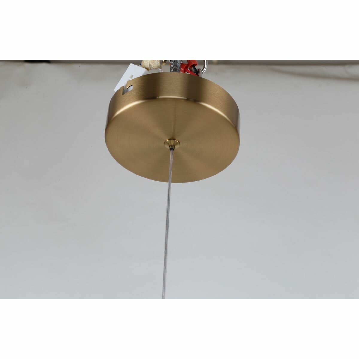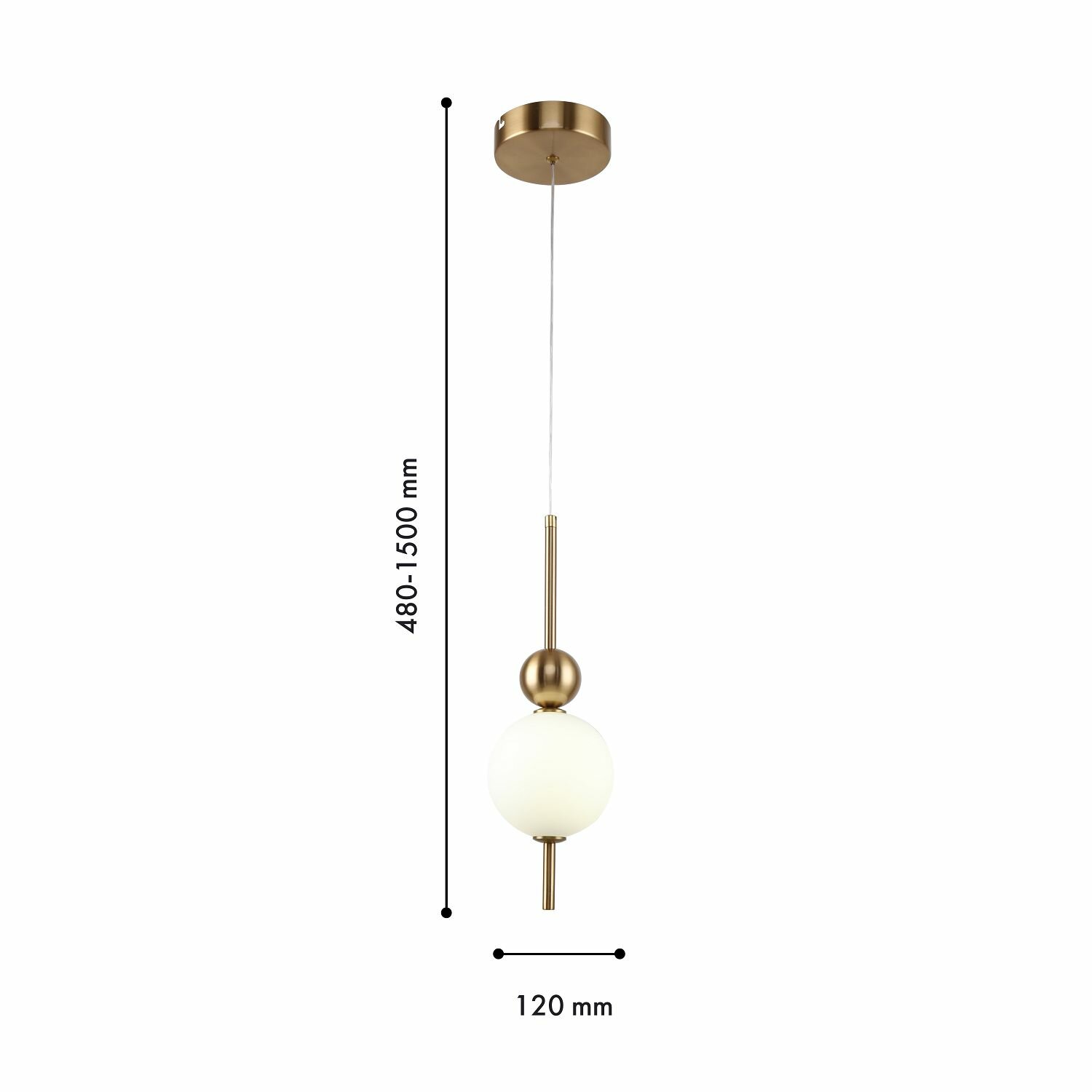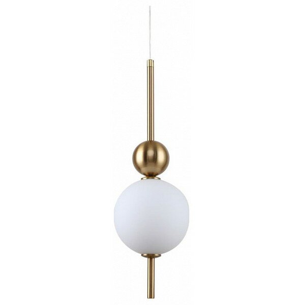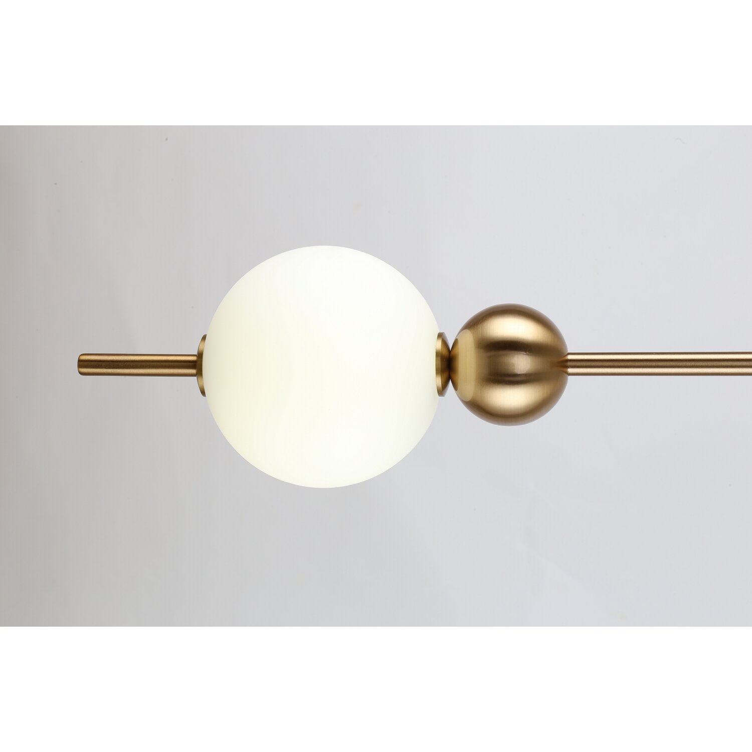 Сочетание плафонов из белого стекла с декоративными шарами и каркасом цвета латуни. Источник света - LED.