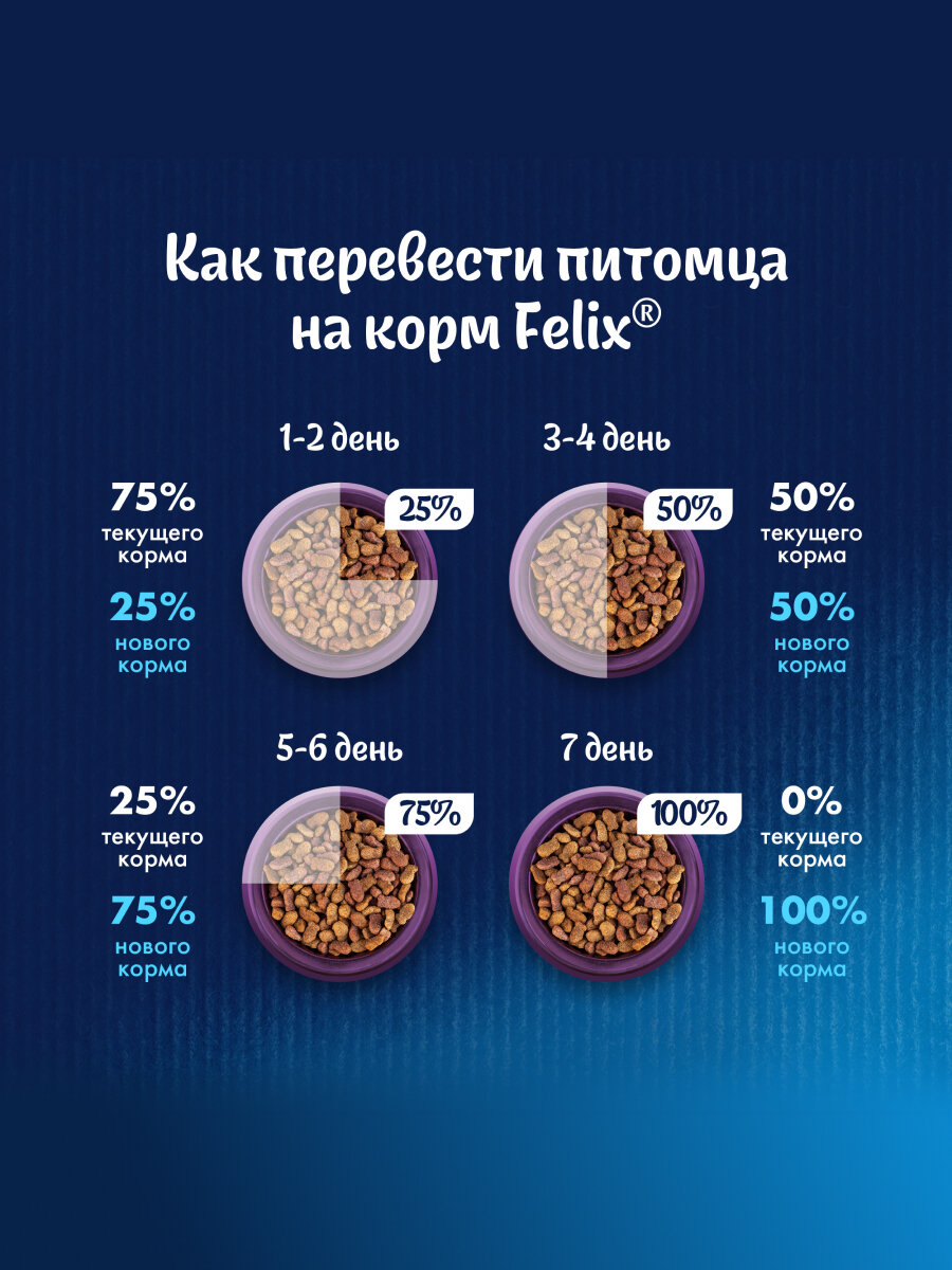 Корм FELIX Мясное Объедение это микс хрустящих гранул естественной формы с повышенным содержанием белка, созданный, чтобы побаловать Вашего кота всей полнотой мясного вкуса, которую он заслуживает. Ваш пушистый озорник полюбит яркий вкус корма FELIX Мясное Объедение, ведь он изготовлен без добавления искусственных красителей, ароматизаторов и консервантов! Ваш любимец также оценит сочетание мясных ингредиентов и овощей, ведь кошки так любят разнообразие в питании. И это еще не все! Корм FELIX Мясное Объедение содержит оптимальное сочетание сбалансированных минеральных веществ и витаминов. Он на 100% удовлетворяет ежедневные потребности Вашего питомца в правильном питании. Пожалуйста, следуйте рекомендациям по кормлению, указанным на упаковке.