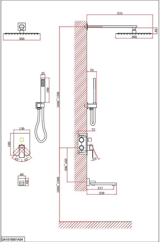- Размер верхнего душа (ШxД): 300 x 300 мм.