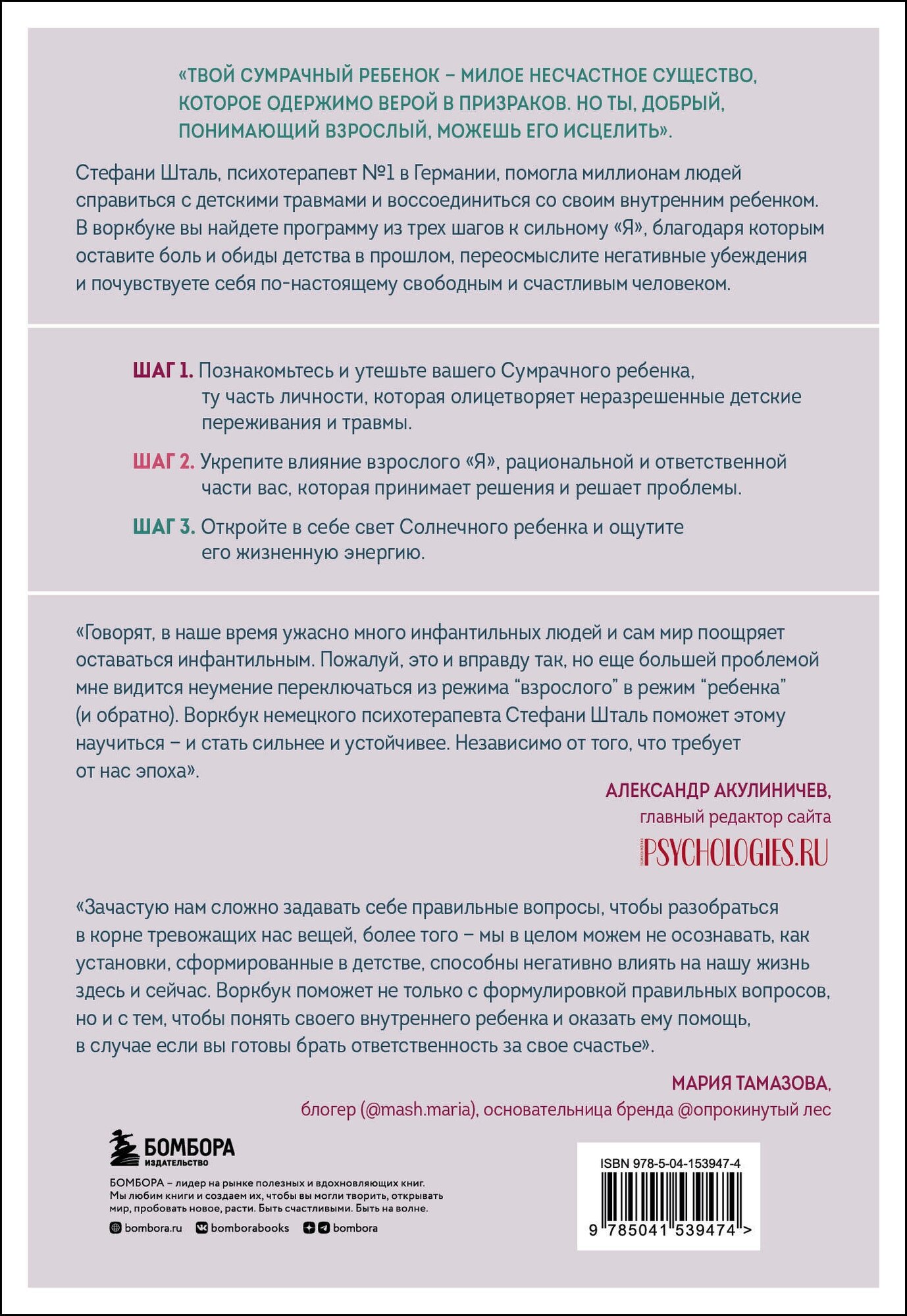 Стефани Шталь, психотерапевт № 1 в Германии, помогла миллионам людей по всему миру справиться с детскими травмами и воссоединиться со своим внутренним ребенком. Ее воркбук - программа из трех шагов к сильному "Я", благодаря которым вы оставите боль и обиды детства в прошлом, переосмыслите негативные убеждения и почувствуете себя по-настоящему свободным и счастливым человеком.