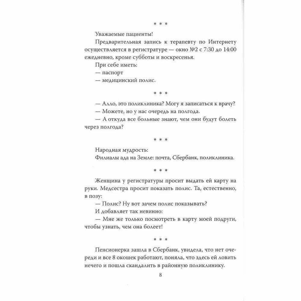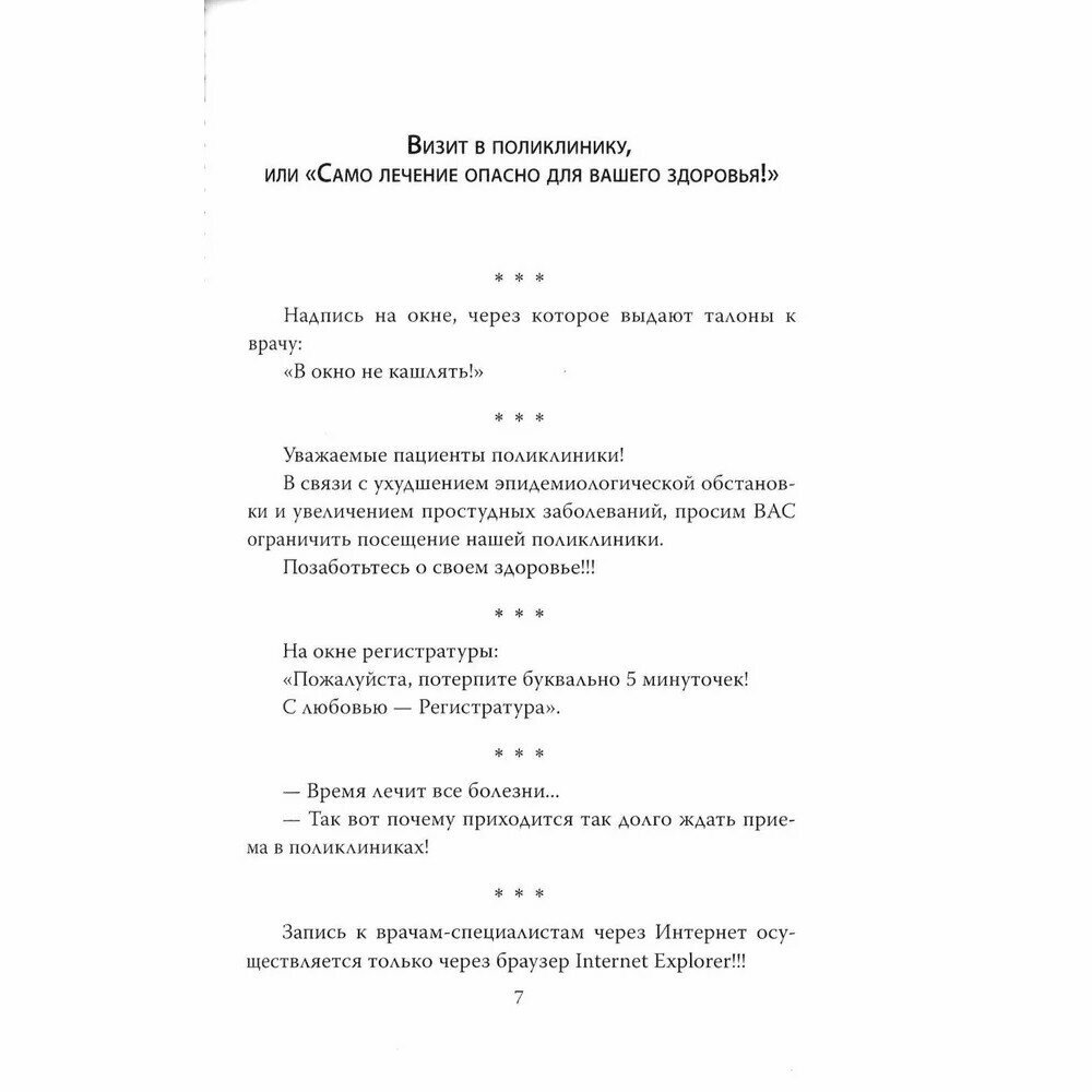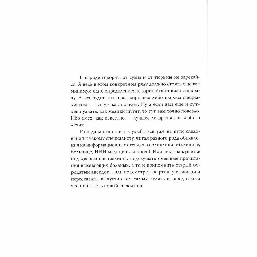 "Если фотоальбомчик маленький и тоненький, а фотография одна и страшненькая - это медицинская карточка..." И в такой карточке может стоять: "У больного имеется жена, две дочери и прямая паховая грыжа". Не верите? Тогда читайте уникальный сборник, где налицо все доказательства того, что медики не только лечат, но и шутят! А специфической юмор медработников можно считать самым остроумным, самым смешным, самым-самым - среди всех других "профессиональных" острот. И ведь грешат медицинские работники не только анекдотами, но и не менее анекдотическими историями, которые происходят в их присутствии с многочисленными пациентами! А это куда как веселей любых забавных ситуаций, подсмотренных в кино! Ну например. Больница "Скорой помощи". Ночь. Дежурство. Все уже разошлись дрыхнуть. Время от времени вызывают дежурных принять новых больных, у каждого дежурного своя палата. И вот, наконец… Впрочем, зачем так сразу и рассказывать?! Открывайте книжку - не пожалеете!