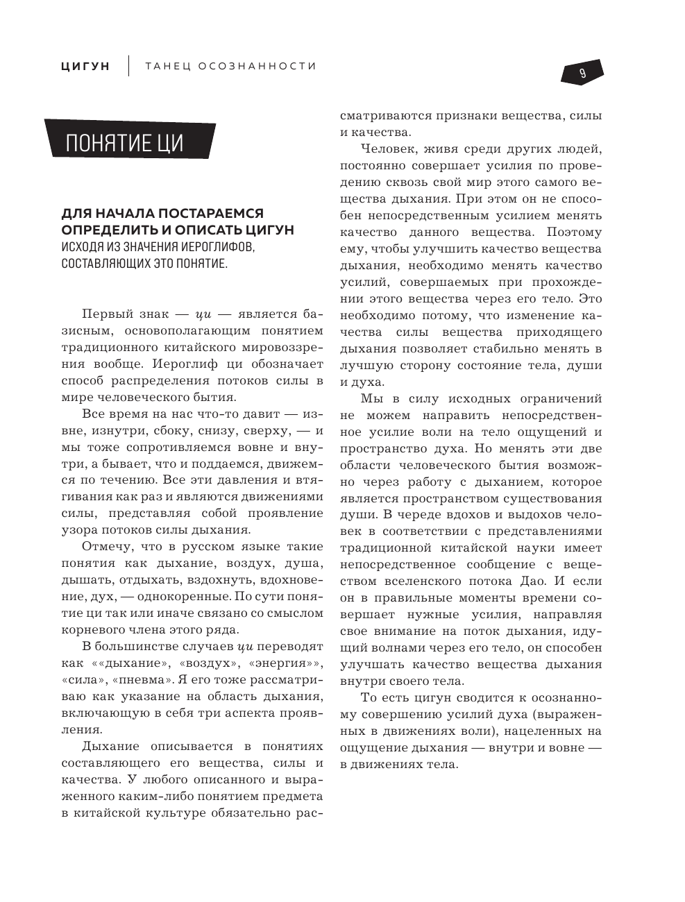 По сути, цигун сводится к осознанному совершению усилий духа, нацеленных на ощущение дыхания. В череде вдохов и выдохов человек имеет непосредственное сообщение с веществом вселенского потока Дао.