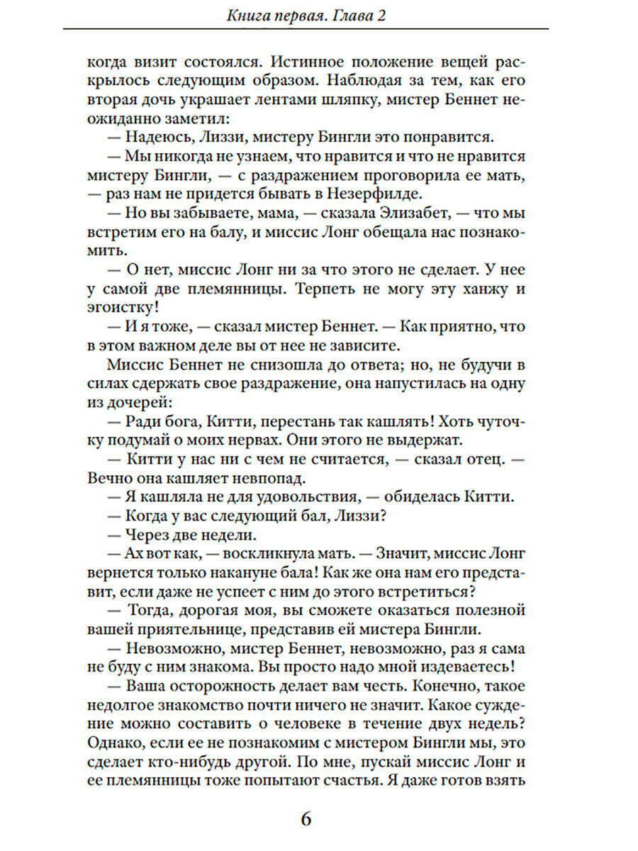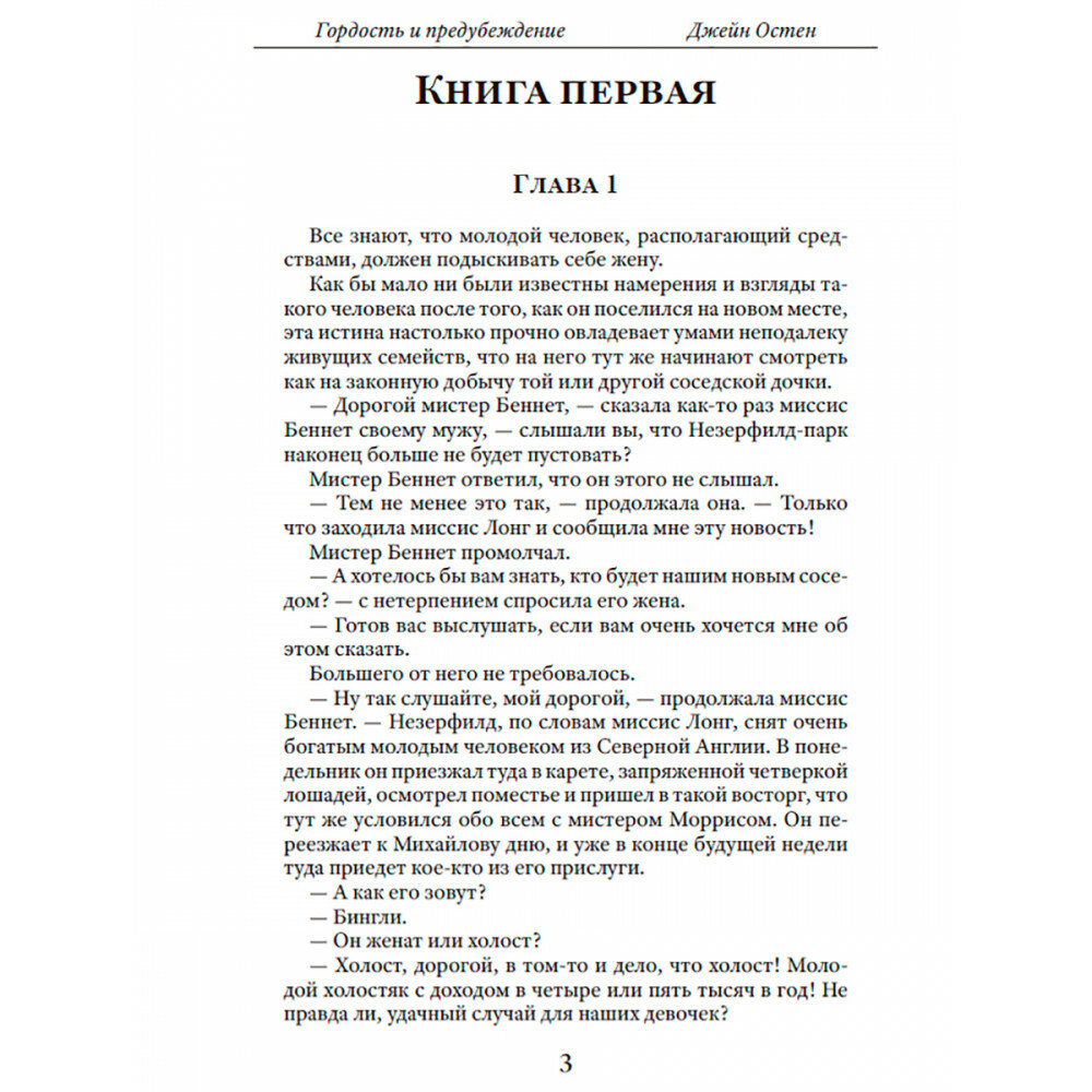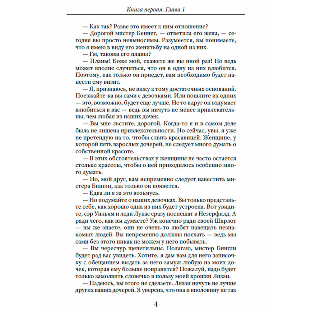 Одна из самых любимых романов из классики.Описание героев и их действий.Различные локации и приятный слог автора.Описание балов,поездок все это остаётся в памяти,но самое главное это любовная линия в книге.Мистер Дарси навсегда останется главным мужчиной в жизни.Издание этой книги очень понравилось,приятные страницы и шрифт.Спасибо