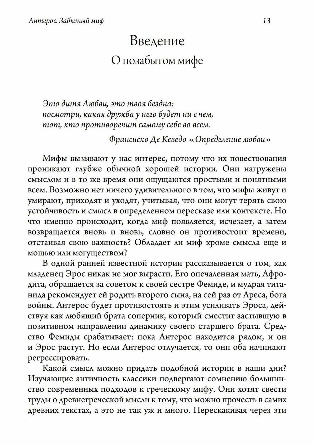 Книга «Антерос. Забытый миф» исследует то, как на протяжении веков миф об Антеросе исчезает и появляется, от классических Афин до наших дней. Также в этой книге рассматривается то, как миф бросает вызов работам Фрейда, Лакана и Юнга. В ней рассматривается последовательный культурный опыт, создавший этот миф и придавший ему форму. Также в книге исследуется то, как миф проливает свет на индивидуальный человеческий опыт и психоаналитический процесс.