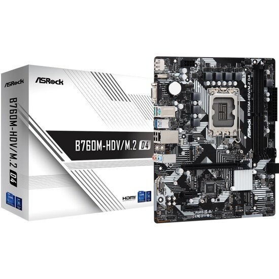 Материнская плата ASRock B760M-HDV/M.2 D4 станет отличным выбором для пользователей, которые хотят собрать универсальный компьютер для дома или офиса, отличающийся компактностью. Модель, соответствующая форм-фактору Micro-ATX, имеет размеры 244x201 мм. Плата, базирующаяся на чипсете Intel B760, совместима с процессорами, для установки которых используется сокет LGA 1700. Возможно использование CPU с ядрами Alder Lake или Raptor Lake.