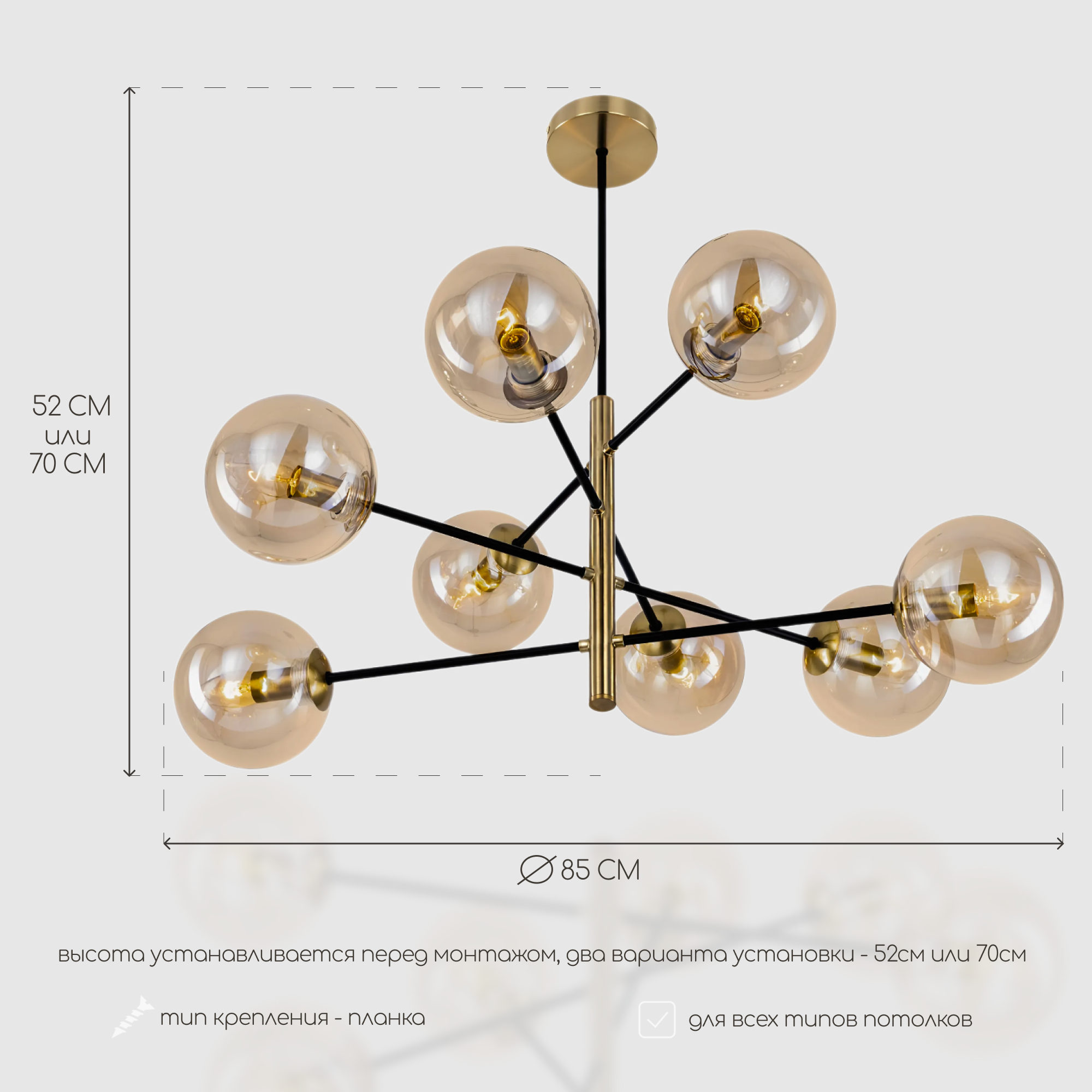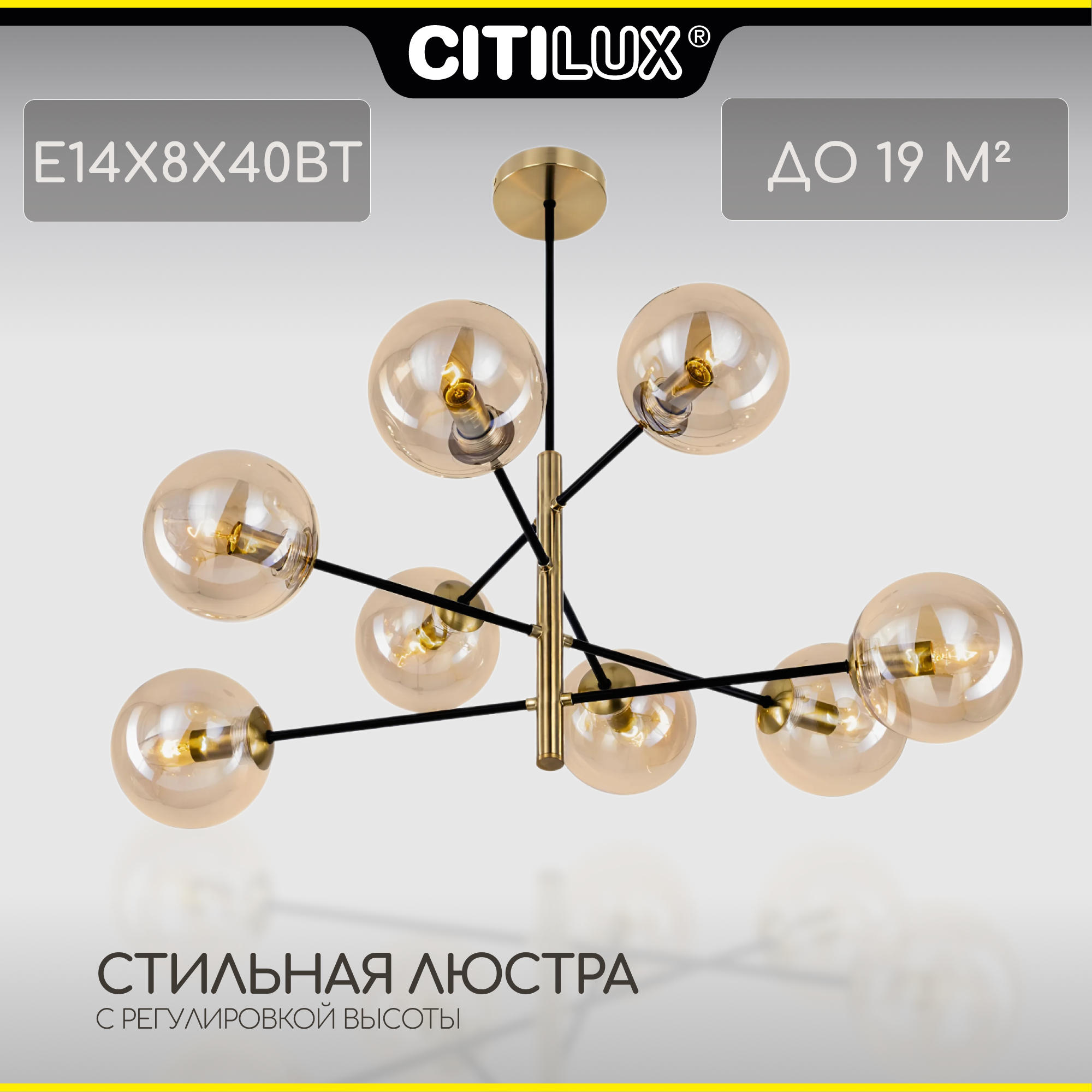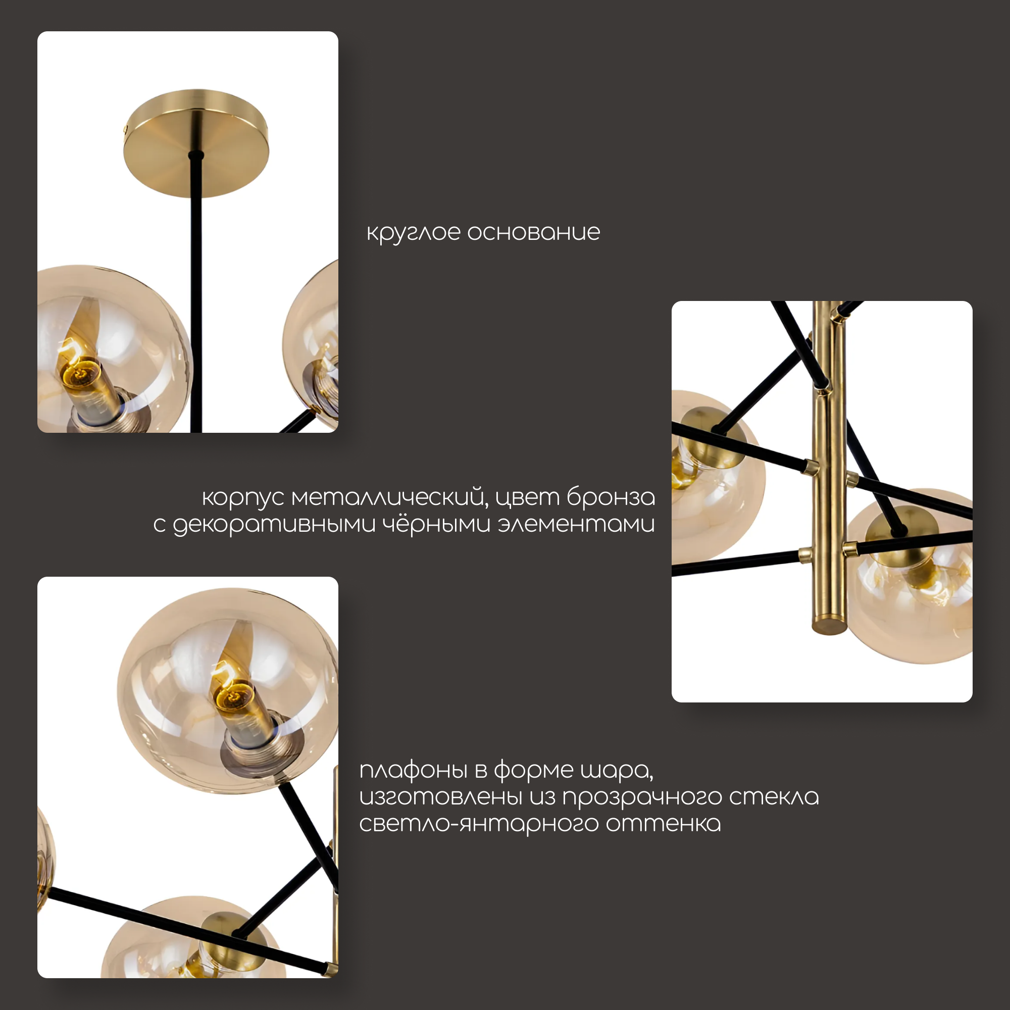 Стильная люстра Citilux Лорен для модных интерьеров, оформленных в стиле модерн или лофт. Корпус светильника металлический, цвет бронза с декоративными чёрными элементами. Основание круглое, рожки-штанги расположены параллельно потолку. Плафоны в форме шара, изготовлены из прозрачного стекла светло-янтарного оттенка. В изделии используются лампы с цоколем Е14, форма колбы свеча, максимальной мощностью для ламп накаливания 40 Вт. Диаметр светильника 85см, высота устанавливается перед монтажом, два варианта - 52см или 70см. Подходит для всех типов потолков, в том числе натяжных, тип крепления – планка. Люстра на штанге Citilux Лорен прекрасный вариант атмосферного освещения современных квартир и уютных загородных домов.