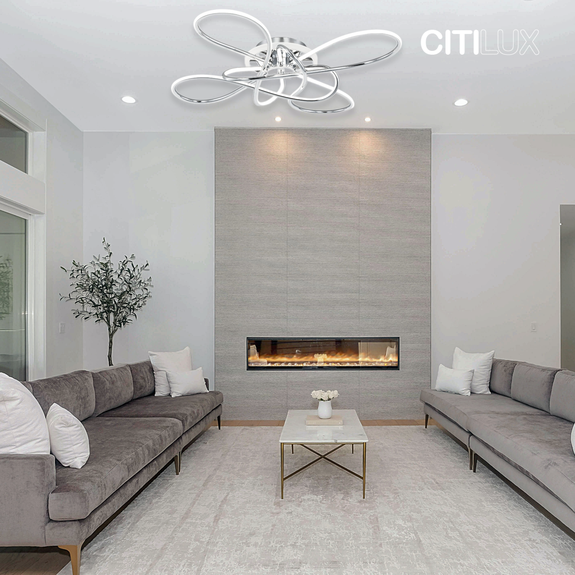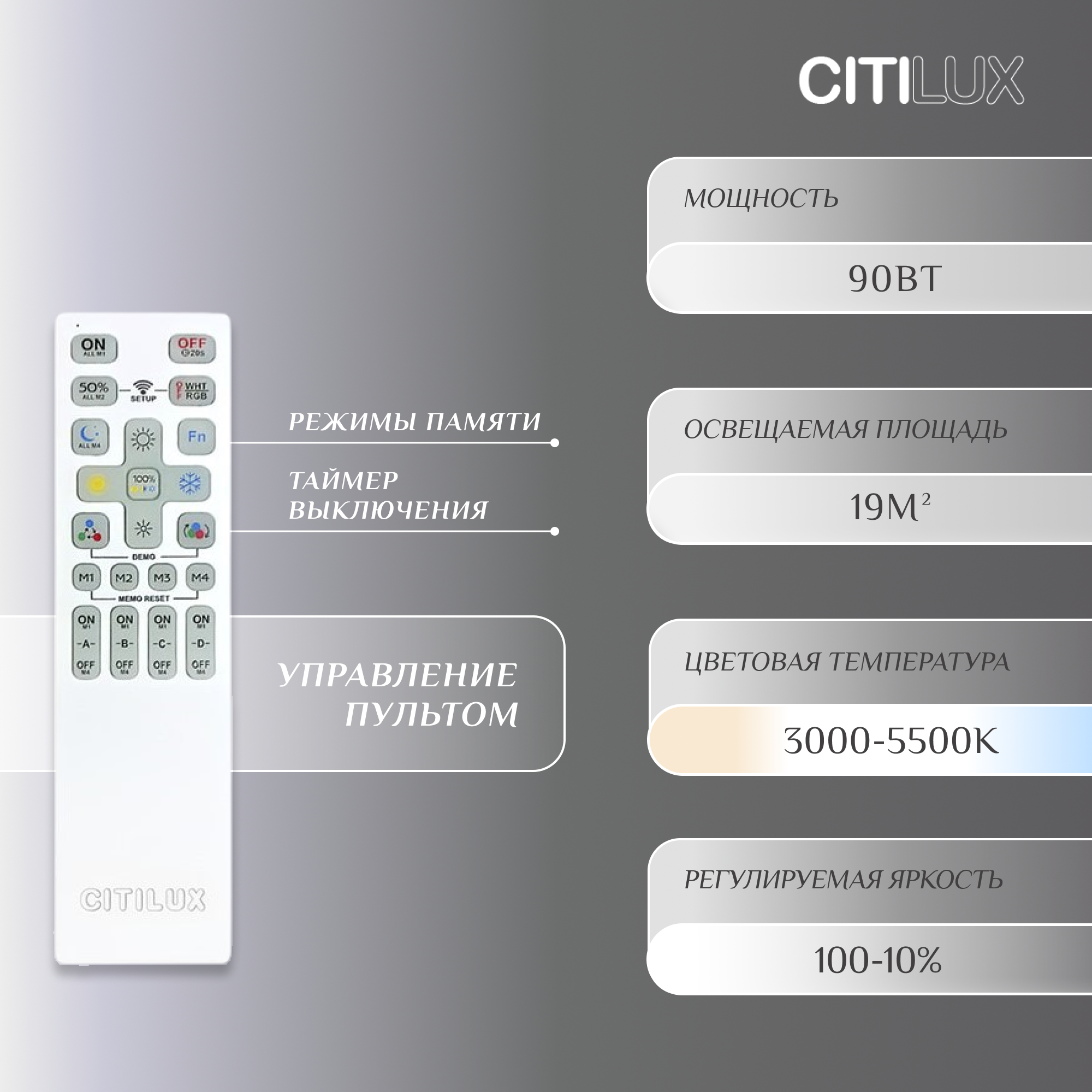 Светодиодная потолочная люстра с пультом Citilux Джемини выполнена в современном стиле. Светильник с круглым основанием и изогнутыми рожками. Корпус металлический, цвет хром. Люстрой можно управлять с помощью радиопульта дистанционного управления и настенным выключателем. Пульт в комплекте, тип батареек ААА (в комплект не входят, приобретаются отдельно). Мощность изделия 90Вт, световой поток 4800Лм, осветит около 19м². Диаметр 65см, высота 12,5см.Пульт ДУ обладает широким набором функций: регулировка яркости от 10% до 100%; управление цветовой температурой в диапазоне 3000-5500К, позволяет настроить любые оттенки теплого, нейтрального или холодного света; 2 режима цветной RGB подсветки основания; отсроченное выключения и режим ночника; 4 кнопки памяти; 4 выделенных канала, к которым можно привязать неограниченное количество светильников.* Опционально: при установке дополнительного смарт-модуля артикул - CLR1M (не входит в комплект, приобретается отдельно) светильник становится умным. Используя сеть Wi-Fi, при наличии интернет-соединения можно полноценно управлять всеми режимами работы светильника из приложения Citilux Smart со смартфона или планшета, а также с помощью голосовых помощников Алиса от Яндекс и Маруся от майл ру.