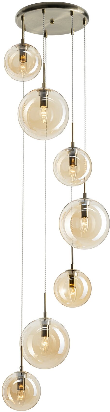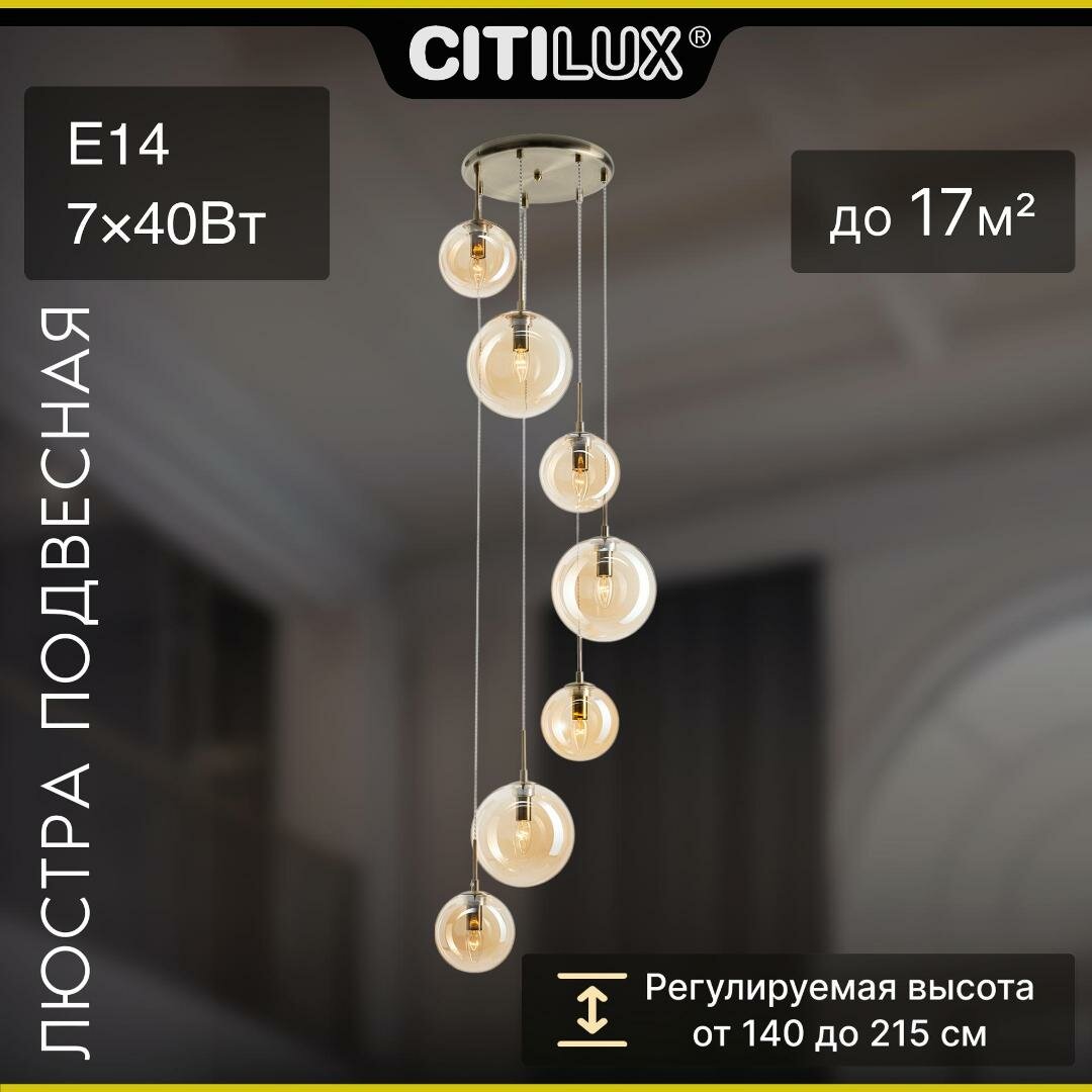 Люстра Citilux Томми с семью подвесными плафонами, выполнена в современном стиле. Основание светильника металлическое, круглой формы, диаметр 30см, цвет бронза. Подвесная спираль каскада сформирована плафонами двух размеров, диаметром 15см и 20см. Плафоны в форме шара, из прозрачного стекла, светло-янтарного оттенка. Диаметр люстры 42см, высота легко регулируется при установке, в диапазоне от 1,4м до 2,15м. В изделии используются лампы с цоколем Е14, форма колбы свеча, максимальной мощностью для ламп накаливания 40Вт (лампы в комплект не входят, приобретаются отдельно). Каскадная люстра Citilux Томми отличный вариант освещения модных пространств со вторым светом, лестниц в уютных загородных домах и современных квартир с высокими потолками.