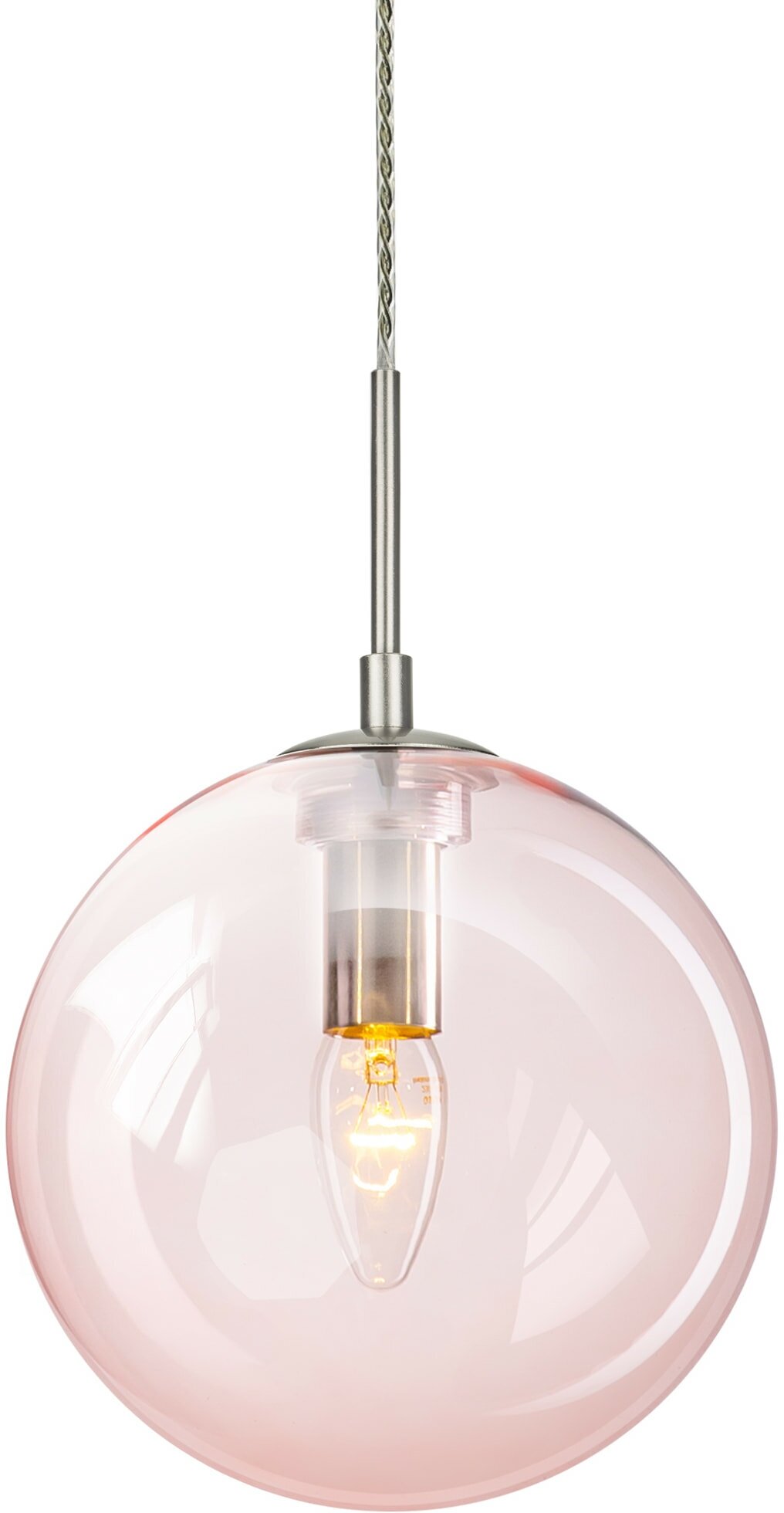 Подвесной светильник Citilux Томми выполнен в современном стиле. Основание металлическое, цвет матовый хром. Плафон в форме шара, изготовлен из прозрачного стекла, розового оттенка, диаметр 20см. В светильнике используется 1 лампа с цоколем Е14, форма колбы свеча, максимальной мощностью для ламп накаливания 40Вт (лампа в комплект не входит, приобретается отдельно), осветит до 2м². Высота легко регулируется при установке, в диапазоне от 34см до 1,25м. Модель подходит для всех типов потолков, в том числе натяжных. Тип крепления – планка. Подвесной светильник Citilux Томми великолепно выглядит над прикроватной тумбочкой, в зоне стола или над стойкой бара.