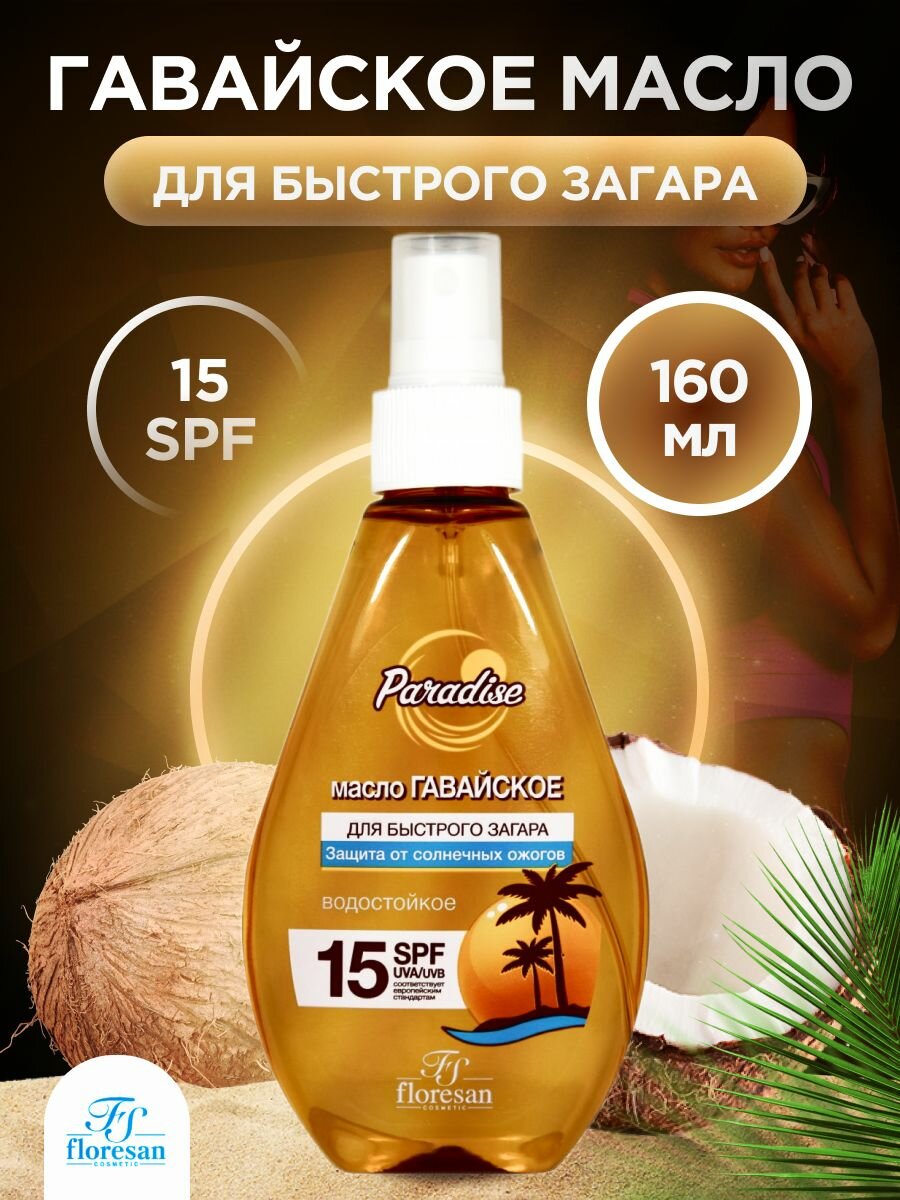 Масло для быстрого загара Гавайское SPF 15. Способ применения: нанести масло на кожу лица и тела за 10-20 минут до принятия солнечных ванн.