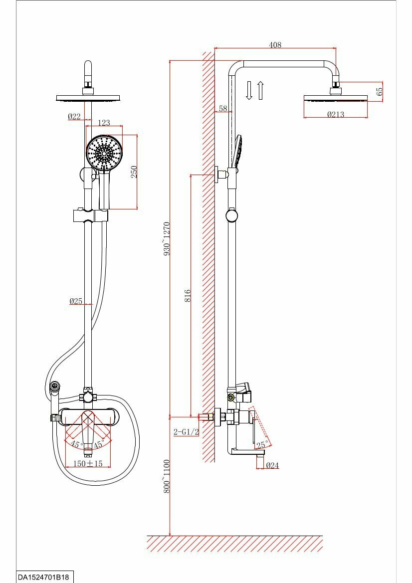 - Душевая штанга регулируется по высоте: 930-1270 мм.