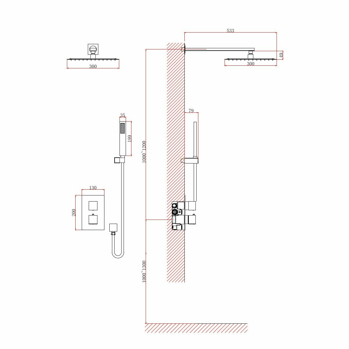 - Размер верхнего душа (ШxД): 300 x 300 мм.