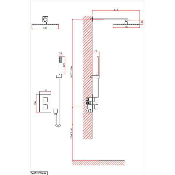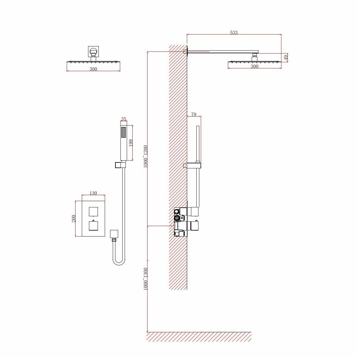 - Размер верхнего душа (ШxД): 300 x 300 мм.