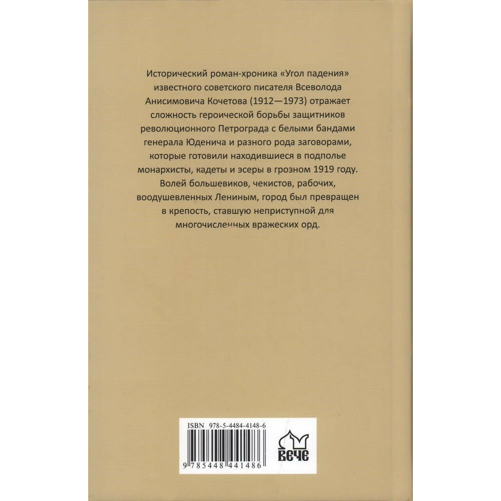 Исторический роман-хроника «Угол падения» известного советского писателя Всеволода Анисимовича Кочетова (1912—1973) отражает сложность героической борьбы защитников революционного Петрограда с белыми бандами генерала Юденича и разного рода заговорами, которые готовили находившиеся в подполье монархисты, кадеты и эсеры в грозном 1919 году. Волей большевиков, чекистов, рабочих, воодушевленных Лениным, город был превращен в крепость, ставшую неприступной для многочисленных вражеских орд.