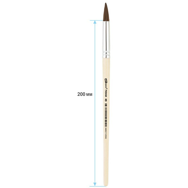 Художественные кисти ArtSpace изготовлены из волоса пони. Он несколько толще, чем у белки, расстояние между волосками больше, поэтому воду такая кисточка набирает меньше, чем из белки или колонка. Приобретают форму конуса, не слишком упруги. Кисть круглой формы с короткой ручкой из дерева идеальна для начинающих художников, поэтому её часто используют в детских образовательных учреждениях.