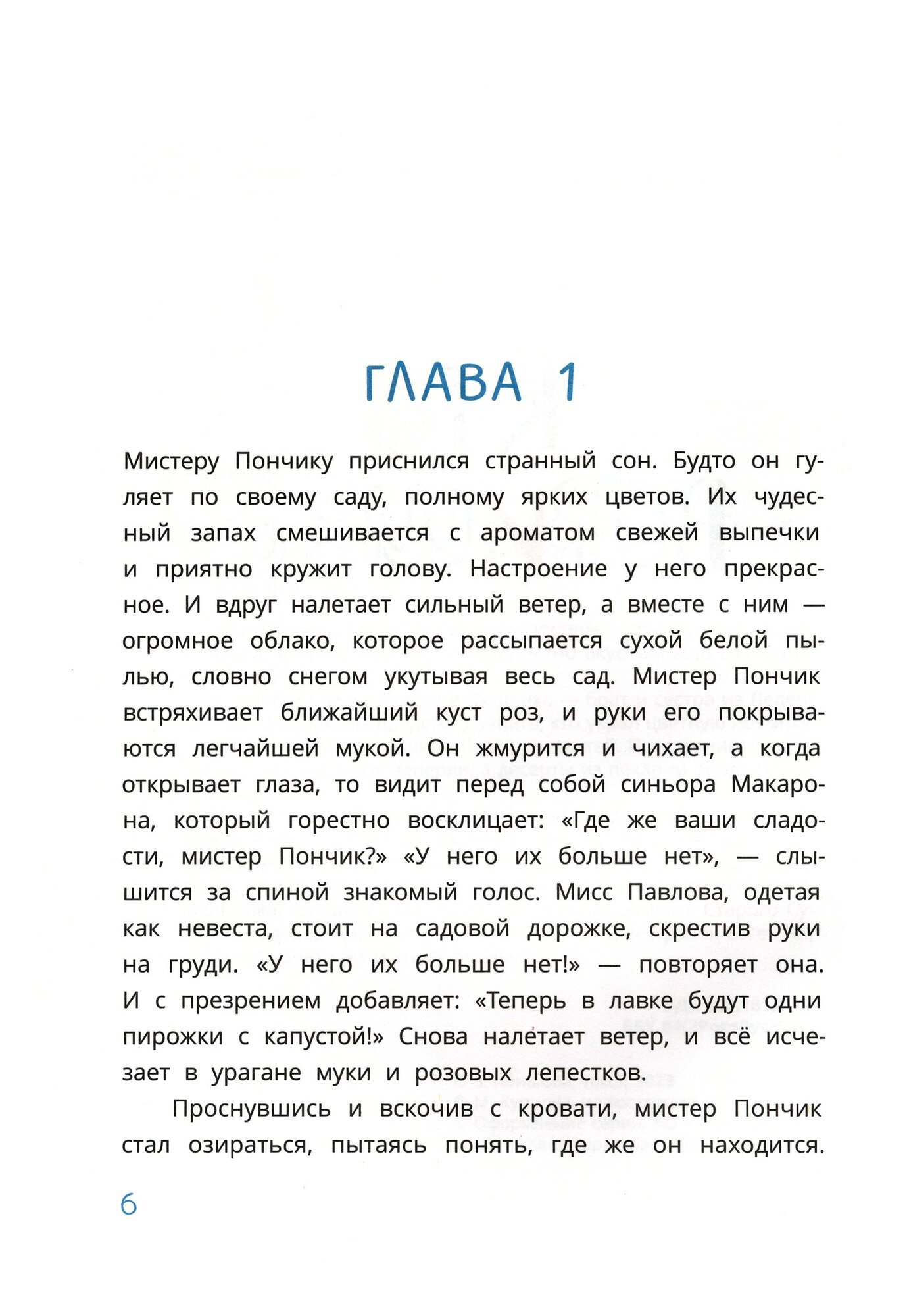 "Мистер Пончик не договорил, потому что банка, на которую он указывал, банка, обычно наполненная нежнейшей, превосходной, великолепной посыпкой, банка с любимым и главным его украшением, его гордостью и важнейшим элементом наряда джентльмена, была ужасающе и непоправимо пуста!"