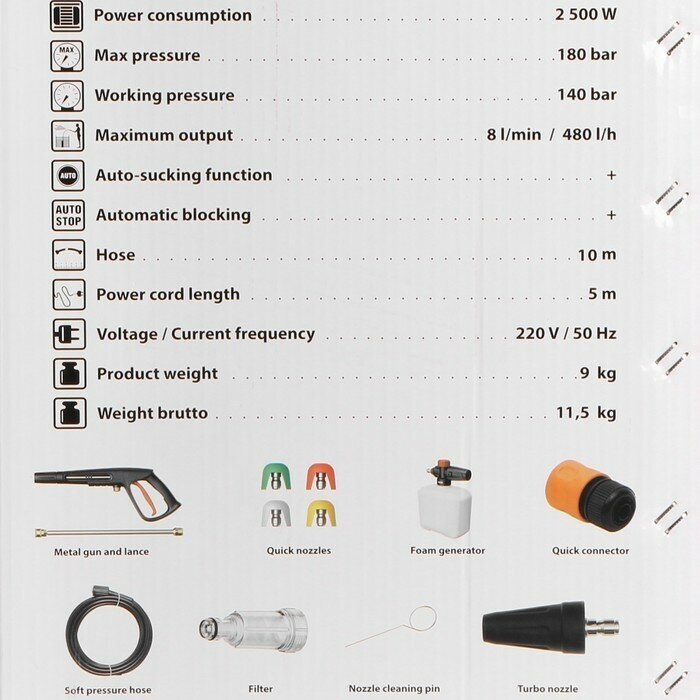 | Оснащение | фильтр,защитный кожух,игла для прочистки,пистолет-распылитель,шланг высокого давления,пеногенератор,барабан для шланга,сменные форсунки,быстросъёмный коннектор,колеса |