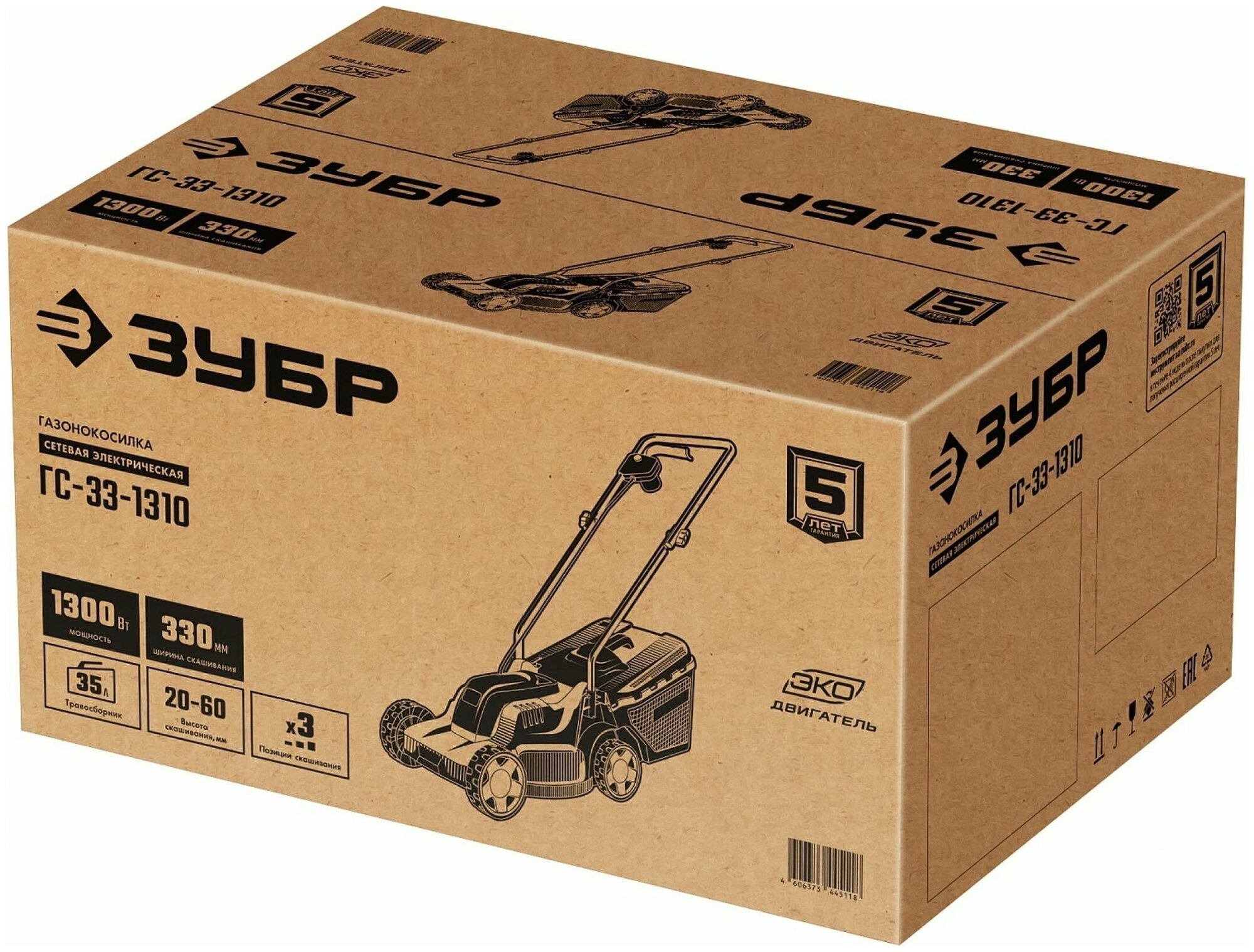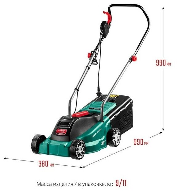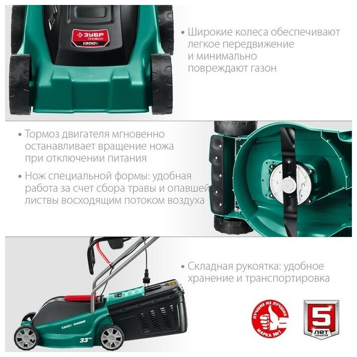 | Прочие особенности и свойства | Меньшее потребление энергии при режущей способности как у бензиновой газонокосилки, Отсутствие необходимости постоянной покупки ГСМ и контроля уровня топлива и масла, Простота эксплуатации и ремонта, а также меньшие шум и вибрация и полное отсутствие вредных выбросов, Травосборник позволяет поддерживать чистоту на обработанном участке и упрощает утилизацию травы, Облегченные колеса и эргономичная рукоятка облегчают перемещение ЗУБР ГС-33-1310 по газону, Кнопки управления расположены под рукой (на рукоятке), что повышает удобство и безопасность работы, Тормоз двигателя мгновенно останавливает вращение ножа при отключении питания для большей безопасности, Ступенчатая регулировка высоты кошения, Тормоз двигателя мгновенно останавливает вращения ножа при отключении питания, Защита от случайного включения, Нож специальной формы: удобная работа за счёт сбора травы и опавшей листвы восходящим потоком воздуха, Комфортная работа: органы управления расположены на рукоятке, Складная рукоятка |