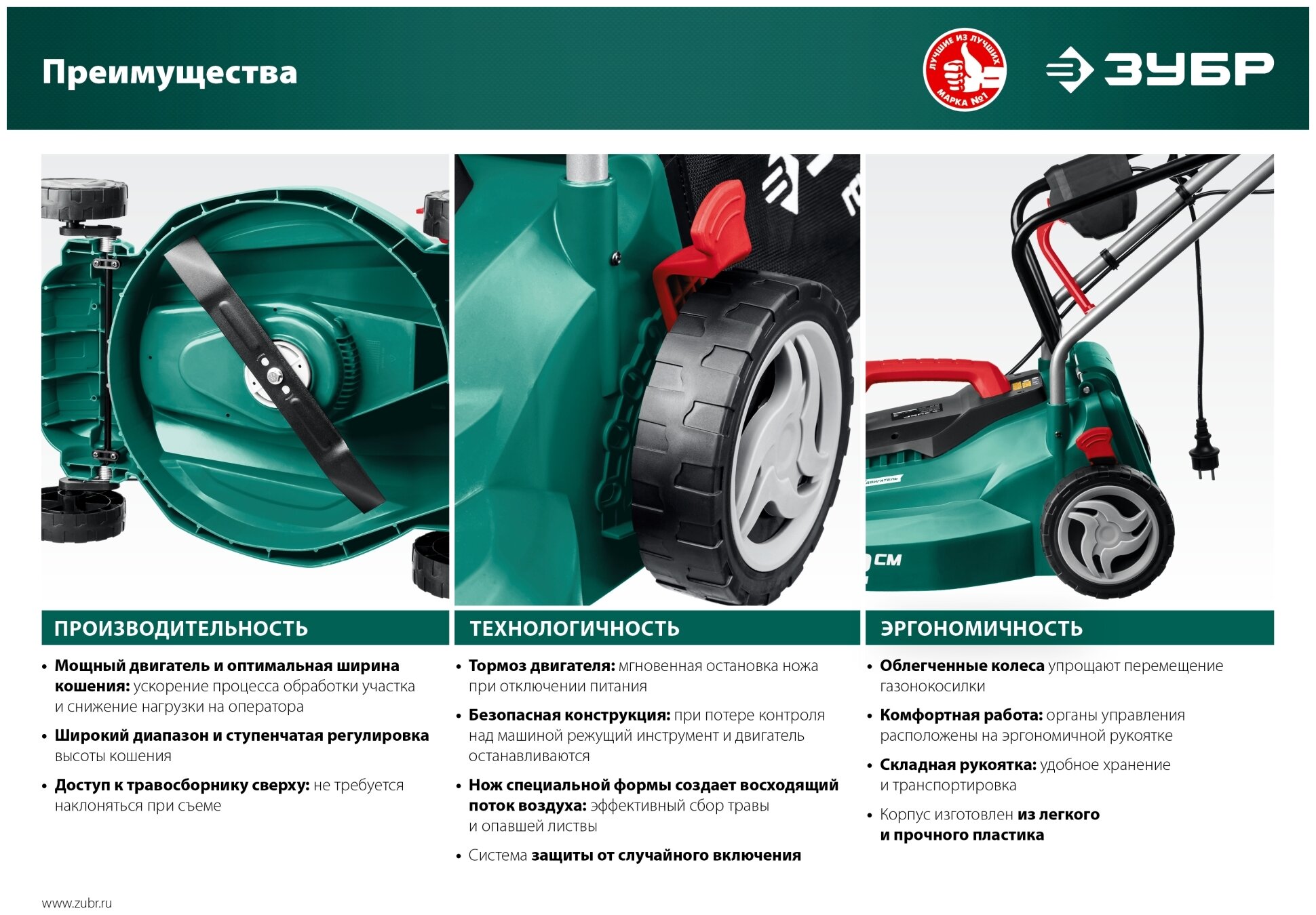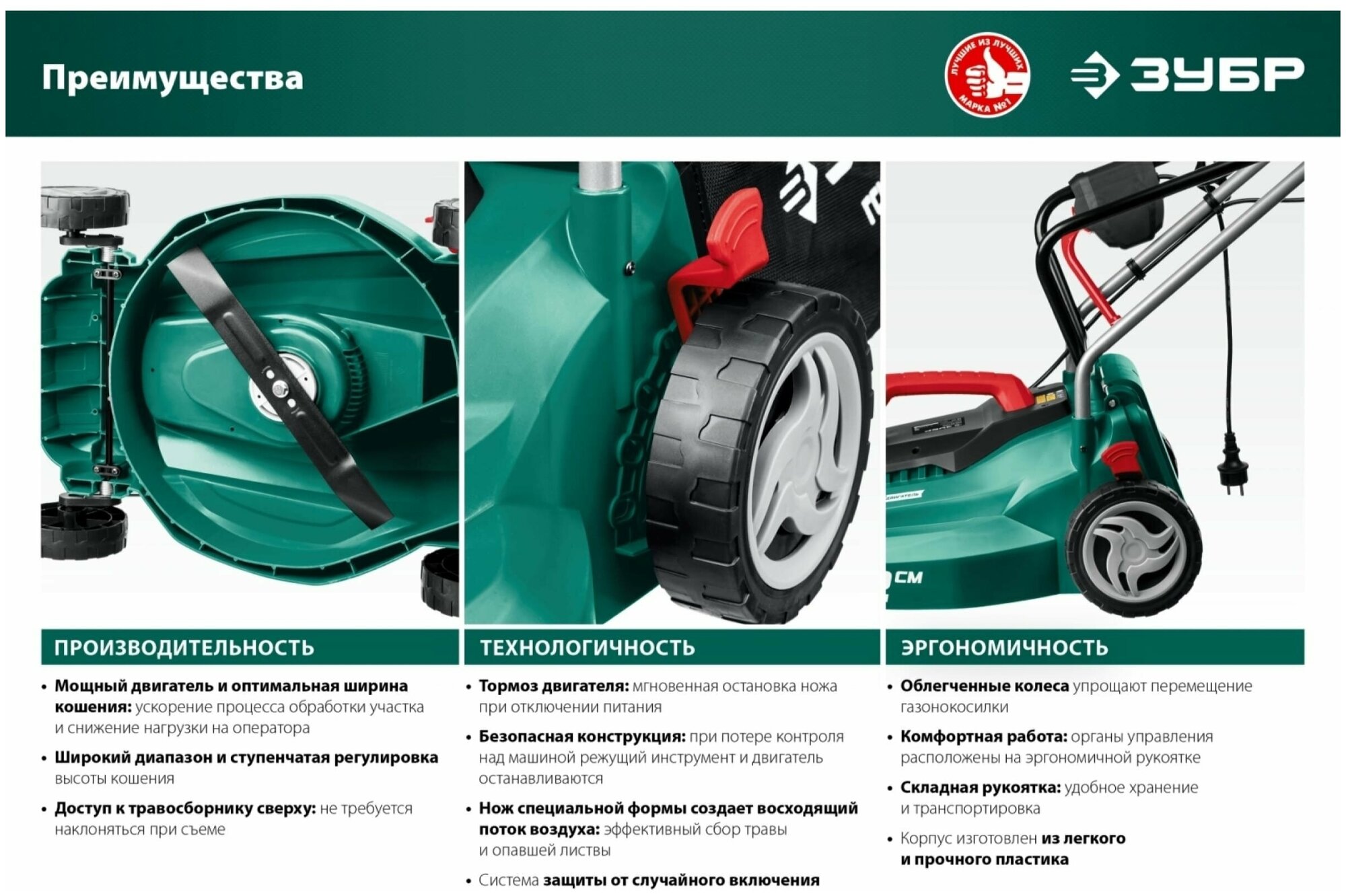 — Облегченные колеса и эргономичная рукоятка облегчают перемещение косилки по газону