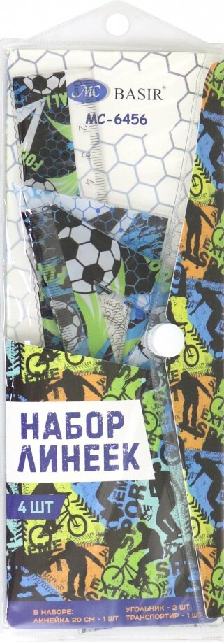 Набор линеек: "Спорт"; 4 предмета: пластиковые с рисунком; 2 треугольника, транспортир, линейка 20 см.