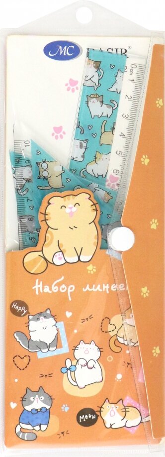 Набор линеек: "Кошка"; 4 предмета: пластиковые с рисунком; 2 треугольника, транспортир, линейка 20 см