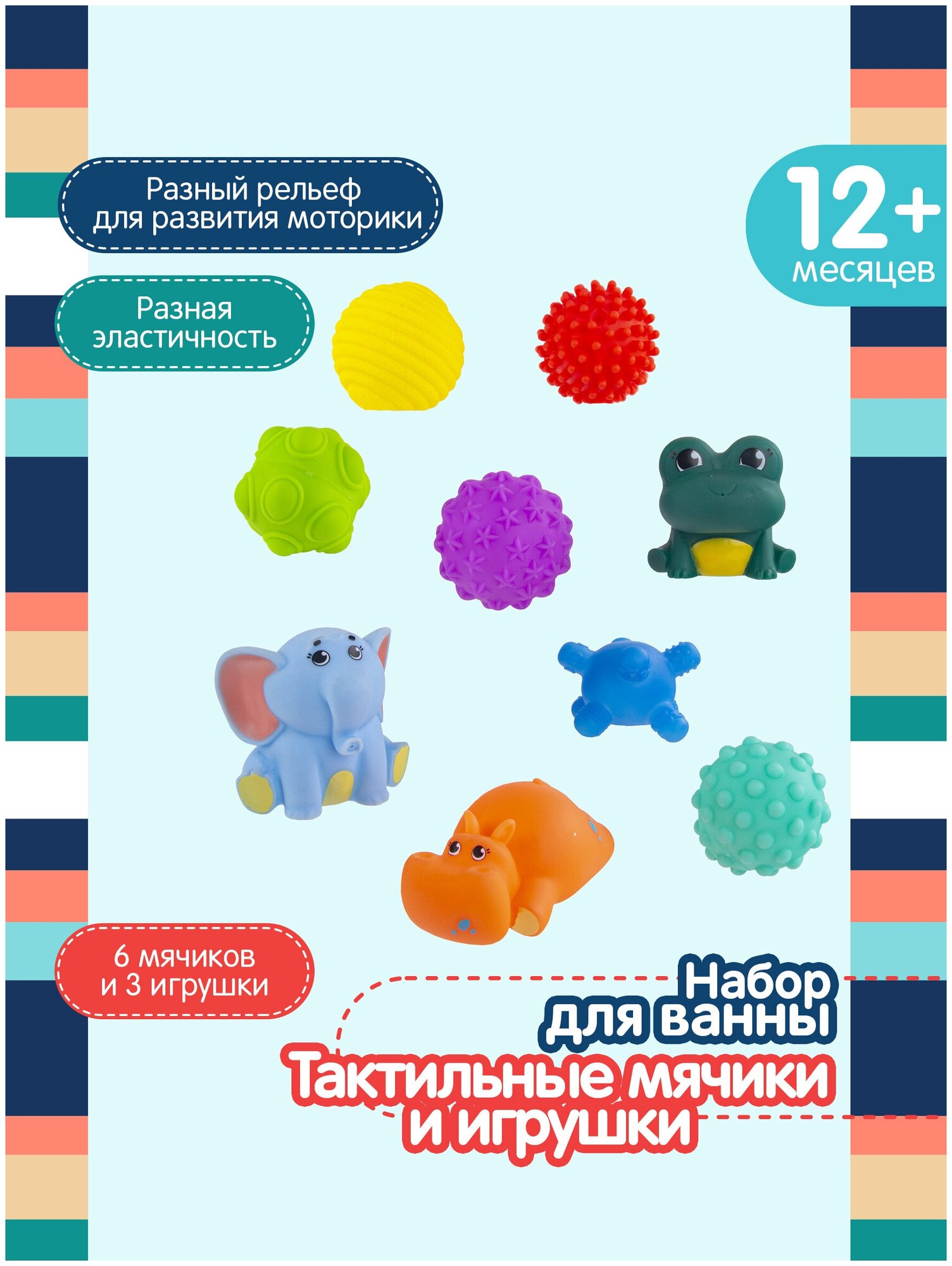 Набор с тактильными мячиками и игрушками для ванны – незаменимый подарок для всестороннего развития малыша. В набор входят 6 тактильных мячиков и 3 игрушки для ванны с пищалками и брызгалками – слоник Джамбо, бегемот Бубба и лягушка Квака. Все мячики и игрушки разных цветов и разной эластичности, сделаны из безопасного материала и приятны на ощупь. Тактильные шарики имеют разную рельефную поверхность и способствуют развитию мелкой моторики и тактильных ощущений. Их очень приятно сжимать в руках, при этом они издают свистящие звуки. С данным набором можно придумать множество развивающих игр – упражнения на развитие моторики, изучение цветов, форм и размеров, игры на память и усидчивость. Такие игрушки используются в работе с педагогами и специалистами по раннему развитию детей. Они отлично подходят для разных игр в воде. Купание будет сплошным удовольствием!