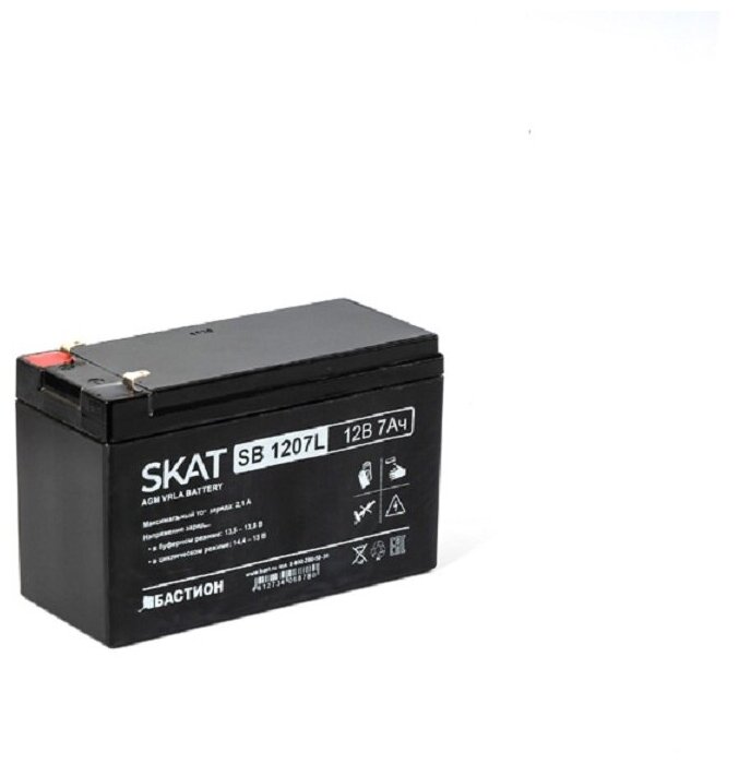 2534 SKAT SB 1207L 12В 7Ач максимальный ток заряда 21 А. Тип клеммы — F1 нож. Размер корпуса — 66х151х100. Вес — 16 кг. Срок службы — 6 лет. Гарантия - 18 месяцев. Бастион SKAT SB 1207L