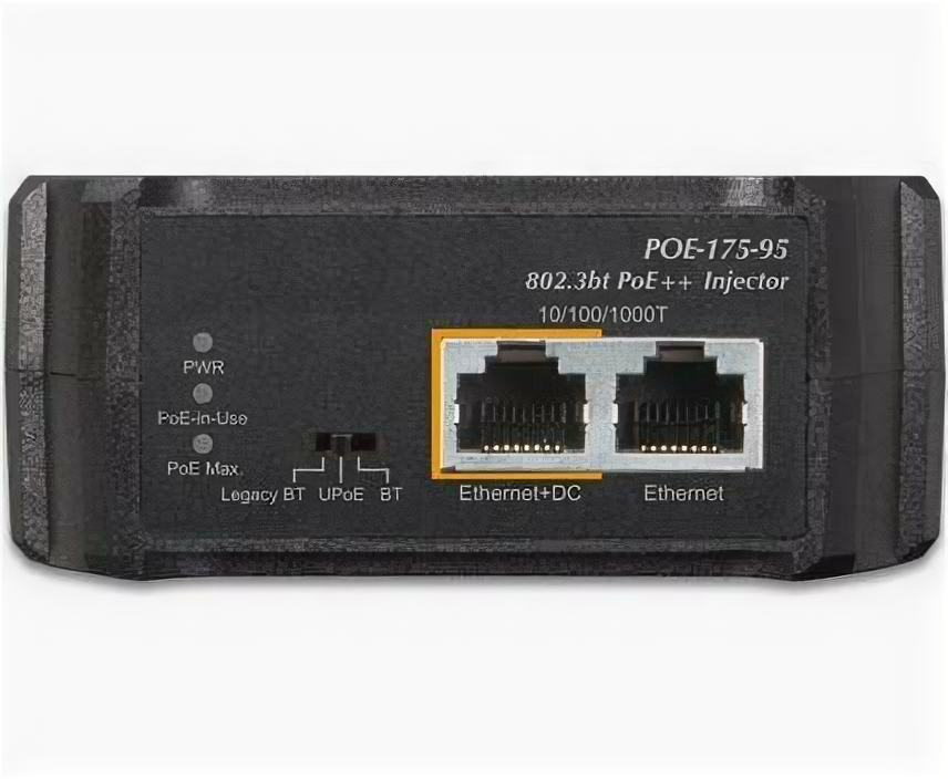| Характеристики | 1-портовый PoE++ инжектор 95 Вт, поддержка стандарта 802.3bt (Type 4), вход: RJ-45 STP Data, выход: RJ-45 STP PoE Out, встроенный блок питания |