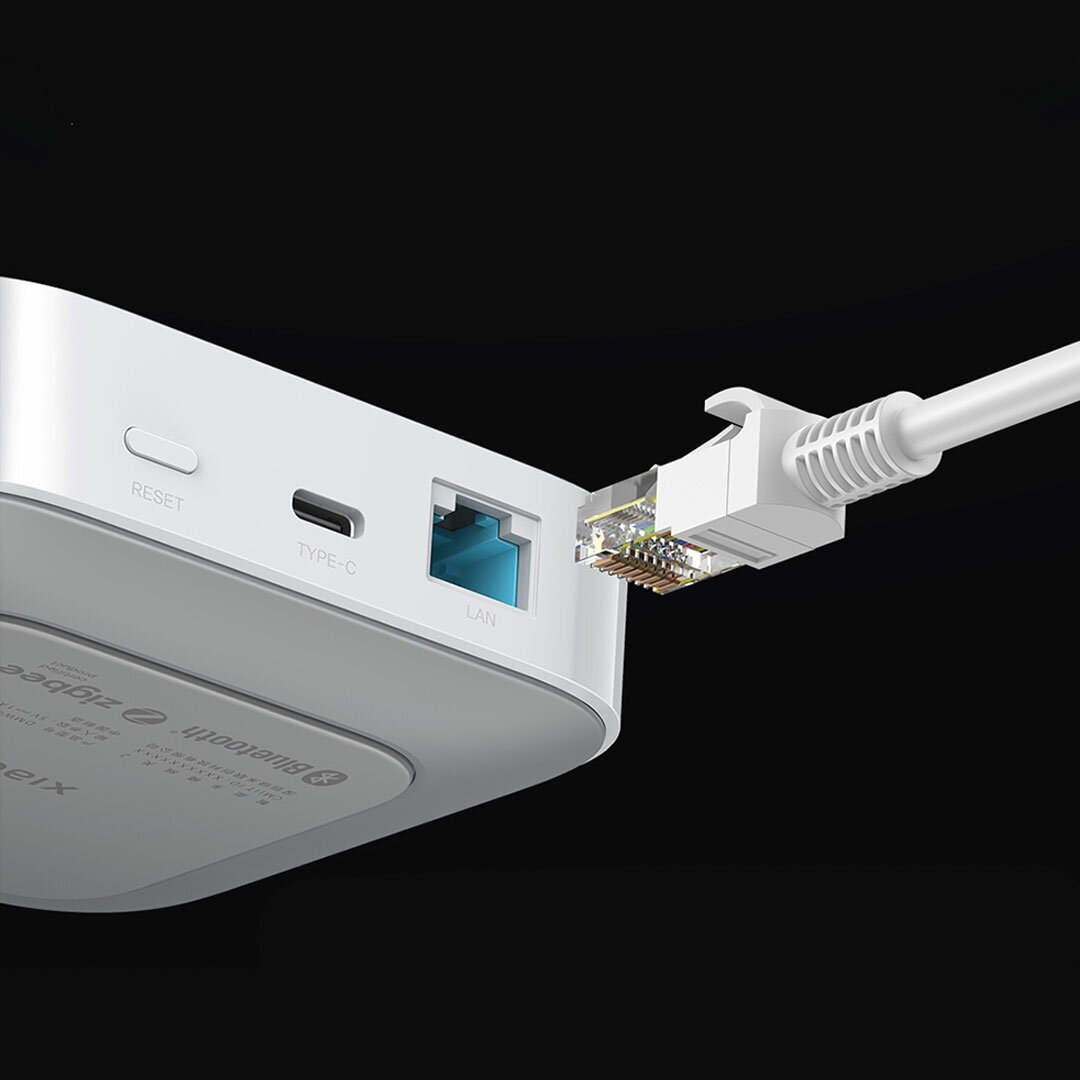 | Возможности | Поддерживает три дополнительных протокола связи (Bluetooth, Bluetooth Mesh и Zigbee 3.0), а также способен подключать к единой смарт-сети до 128 устройств. Оборудовано портом Internet RJ45, что дает возможность подключить шлюз не только по Wi-Fi, но и по проводу. Не поддерживает Apple HomeKit. |