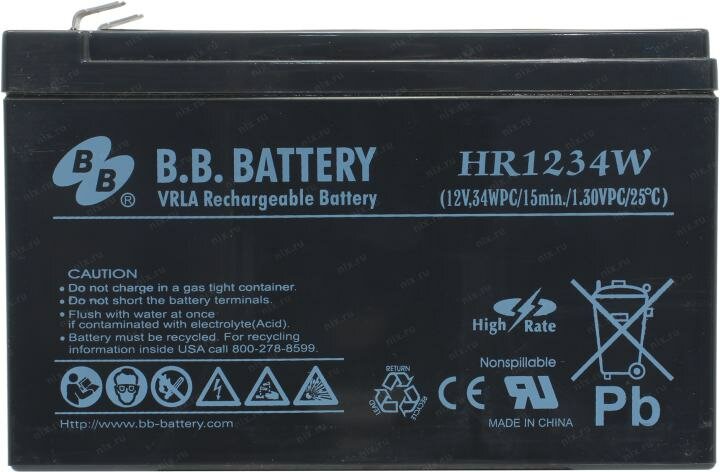 Аккумуляторная батарея BB Battery HR1234W BB Battery HR1234w (12В 9Ач)- свинцово-кислотный, герметичный, необслуживаемый аккумулятор типа AGM (с электролитом абсорбированным в стекловолокне), с применением VRLA клапанов (с системой рекомбинации газов). Батареи BB Battery серии HR имеют отличительные характеристики, которые можно отметить в отсутствии жидкой кислоты, а также низком уровне потребляемой нормы - он составляет около 3% всей емкостной потери в месяц. Эксплуатировать эти аккумуляторные батареи разрешается в любом положении. Эта серия аккумуляторных батарей проектируется для использования выше нормы, а плотность энергии на треть выше аналогичного параметра серии ВР.