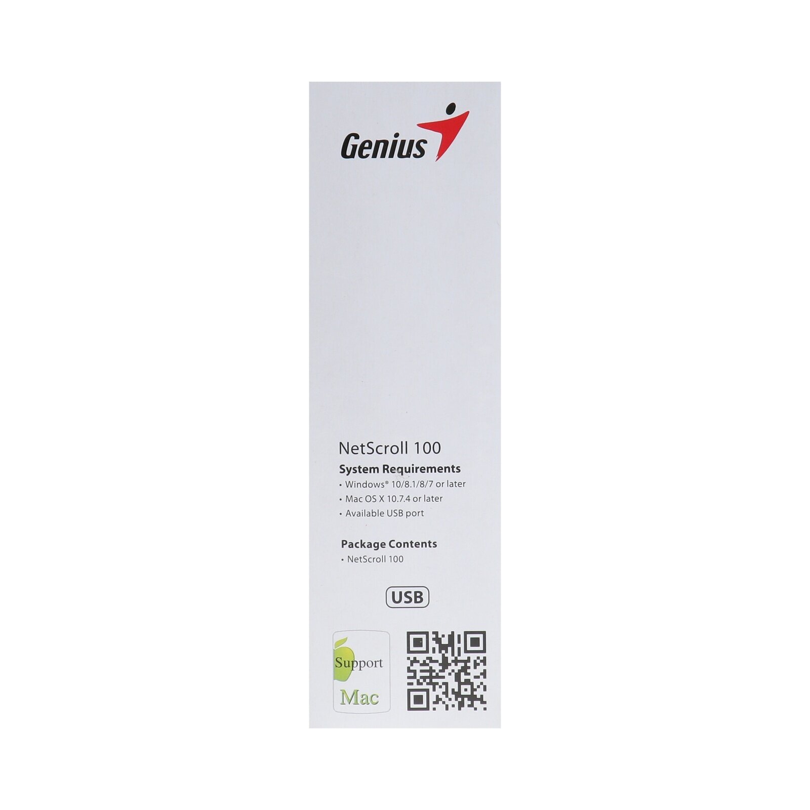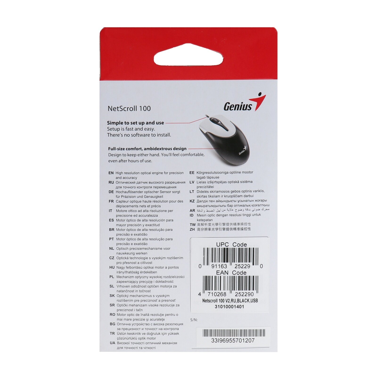 | Прочее | Мышь NetScroll 100 v2 от Genius одинаково удобна как для работы левой, так и правой рукой. Мышь не требует настройки - все, что нужно - просто подключить её к компьютеру., , Оптическая мышь не нуждается в коврике, отсутствие шарика освобождает от необходимости в постоянной чистке. Разрешение в 800 dpi сделает работу за компьютером ещё более удобной. |