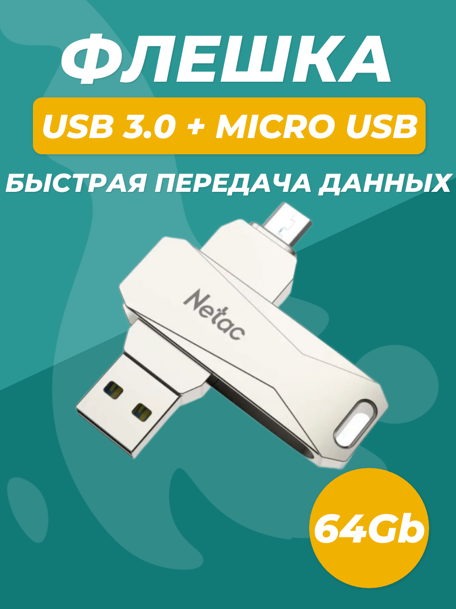Носитель информации Netac U381 USB3.0+MicroUSB Dual Flash Drive 64GB (NT03U381B-064G-30PN)